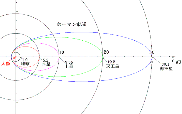 | 地球-土星ホーマン軌道 | 40.0km/s | 4.2km/s |