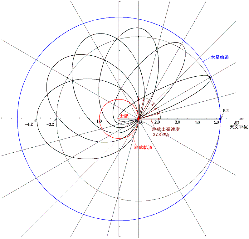 下図は木星に到達するための最低速度37.8km/sで出発し、角度θ0を様々に変えたときの軌道の様子を示す。出発時の角度θ0が増えるにつれて、太陽からの最遠到達距離rmaxが減少してくることに注意。図の描き方は別稿「質点の二次元運動」3.(3)(d)で説明している。数式のグラフ描画ソフトがあれば6.rとφで述べる極座標表示の関数をそのまま描いても良い。