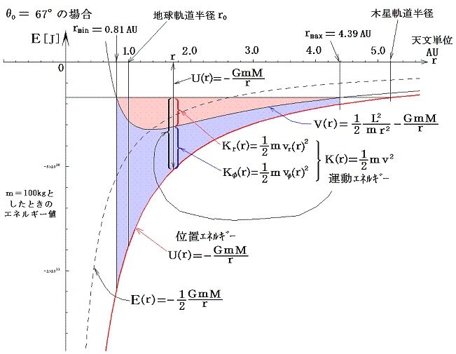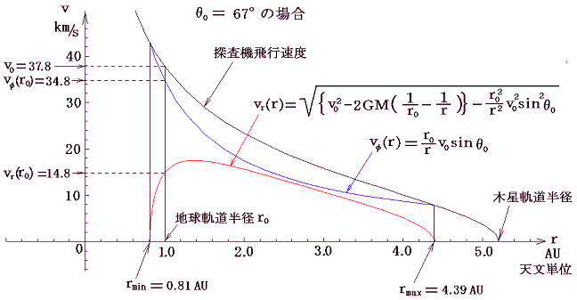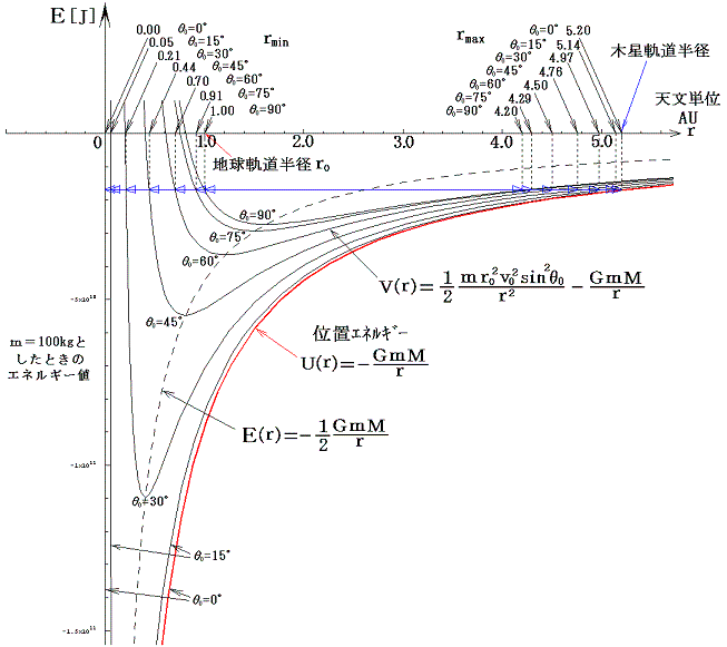 地球Eの軌道半径=r0の位置から角運動量成分=0(つまりθ0=0)、出発速度v0で打ち出されたとき、太陽から最も離れるときの距離をr1(今の場合木星の軌道半径=5.2天文単位)とする。θ0=0の時の最遠到達距離r1は、エネルギー保存則から明らかなようにv0、r0と次式で関係づけられる。