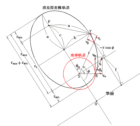 と表される。太陽Sから見た出発地点Eと焦点Fとのなす角φFEは次式から求まる。