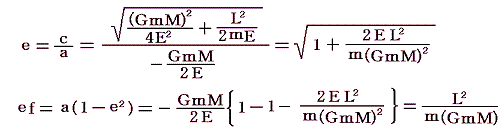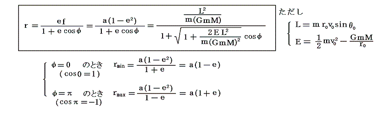 が成り立つ。別稿「質点の二次元運動」3.(3)で説明したように最遠到達距離rmax、及び最近距離rminではvr=0だから、vr=0として上式を連立させて解くと、rmax、rminはL、Eを用いて