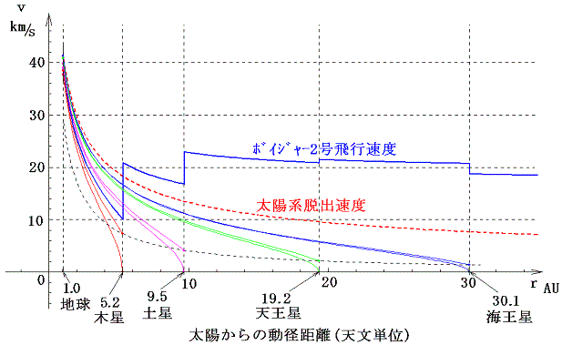 ちなみにNASAのHP(http://www2.jpl.nasa.gov/basics/bsf4-1.html)にボイジャー2号の実際の飛行速度が掲載されている。(ただし、この図のSOLAR