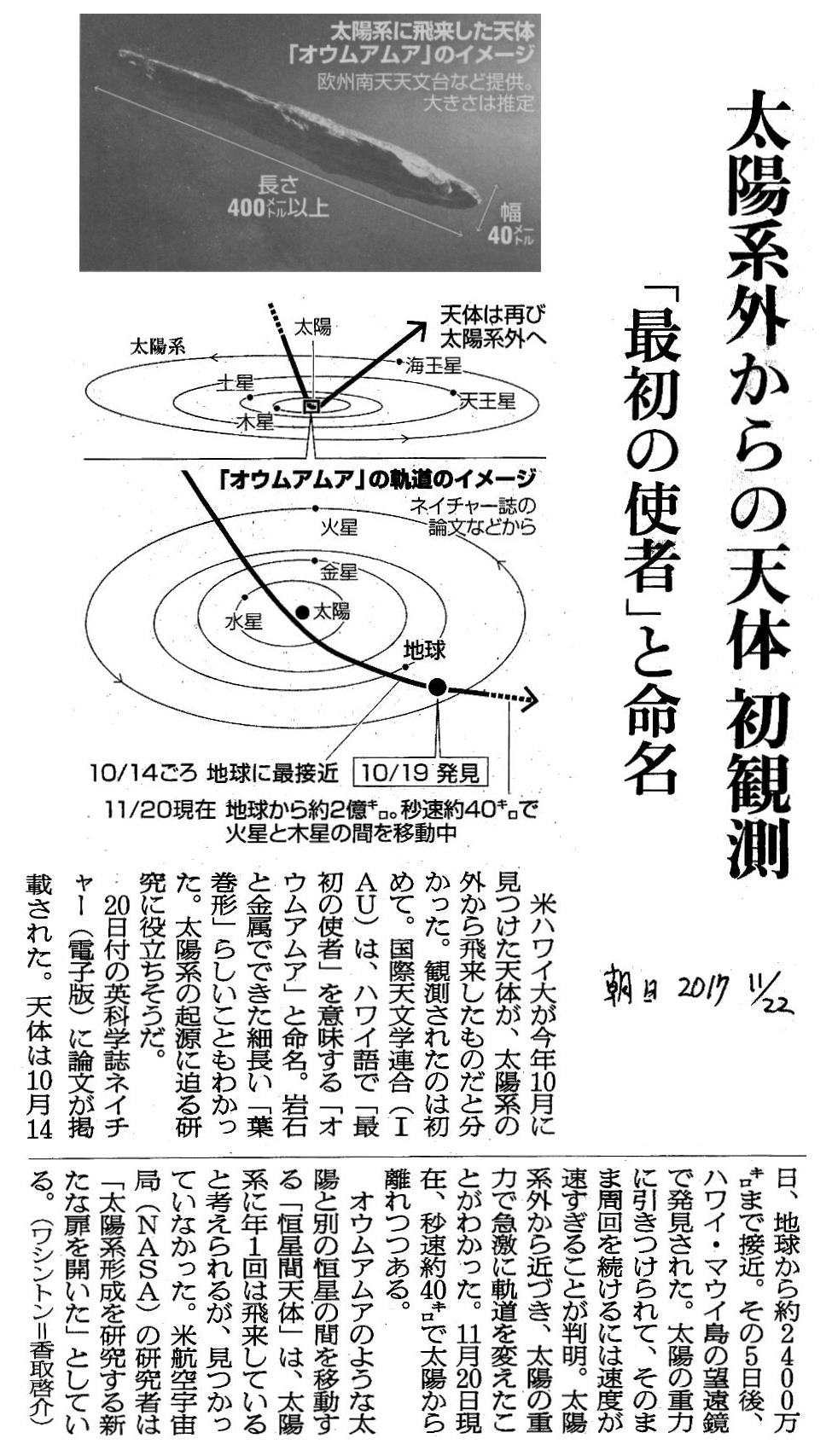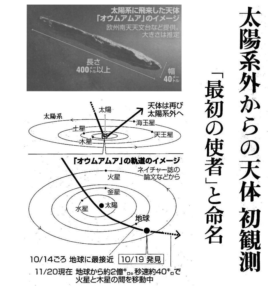 米国ハワイ大学は、 2017年10月19日に発見された天体が、高速で太陽系を縦断して飛び去っていった事を発表した。その天体の飛行速度は太陽系を構成する惑星、小惑星の公転速度よりも遙かに早い速度で太陽系外から近づき、太陽の重力で軌道を変えた後に、11月20日現在秒速約40km/sで太陽系から離れつつある。この速度はボイジャー2号の太陽系脱出時の速度(20km/s)の2倍程度です。