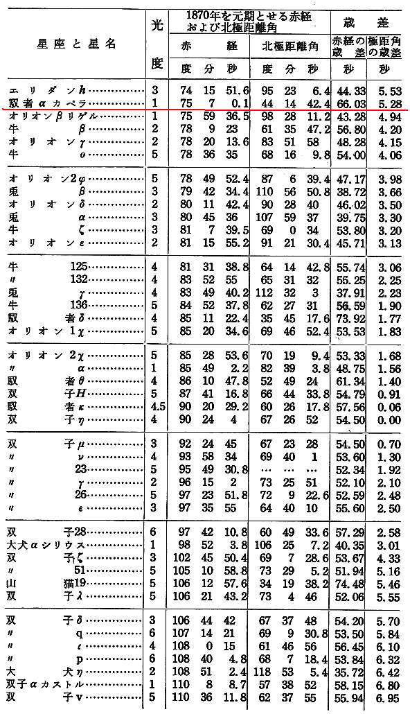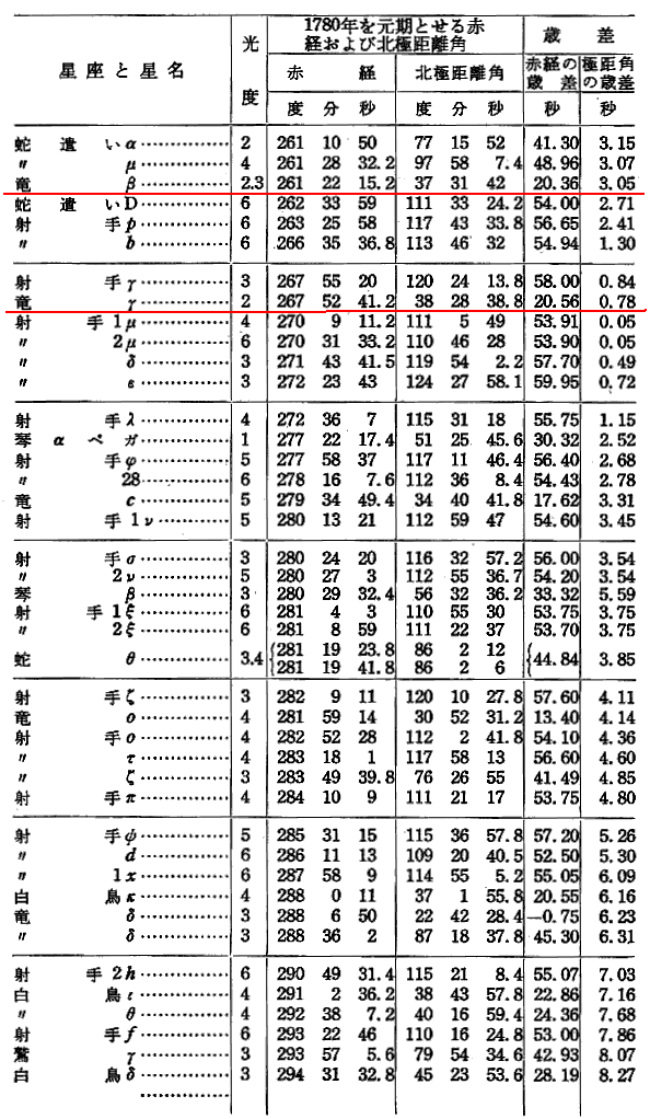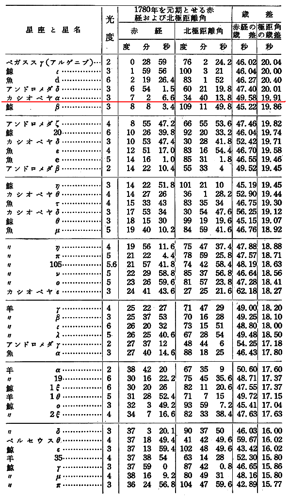 第6欄目に記入してある北極距離角の1年ごとの変化は、赤経90°→180°→270°のあいだに含まれる6宮、即ち下向6宮の星々一の場合は正数となる。というのは、これらの星々はすべて北極から遠ざかりつつあるからである。これとは反対に、270°→0°→90°までの上向6宮の星の場合には負の数となっている。これらは年毎に北極に近づきつつあることを示レている。赤経の変化はどうかというと、特に負の記号のつけてある2星を除いて、すべて正数値である。