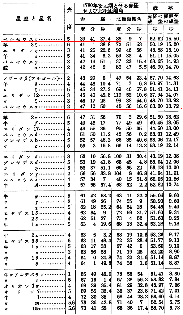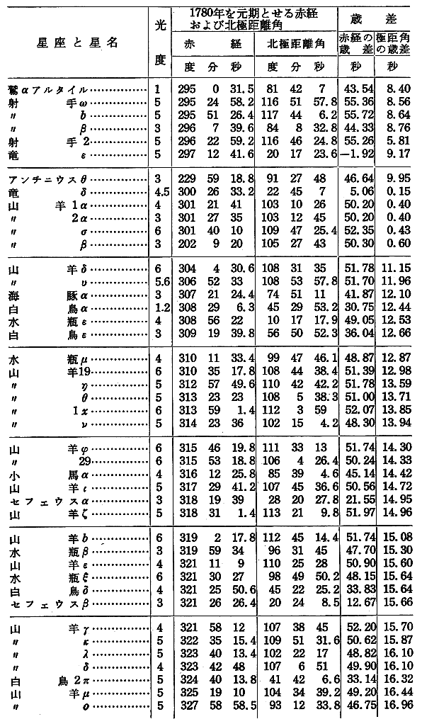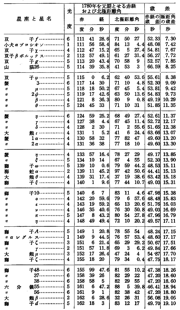 以下に記載する恒星表は、ブラッドリー(1693〜1762年)が公表したもので、英国航海暦からとった。但し赤経と北極距離角とは1780年の分点に改算してある。