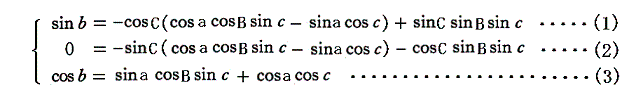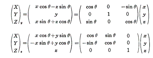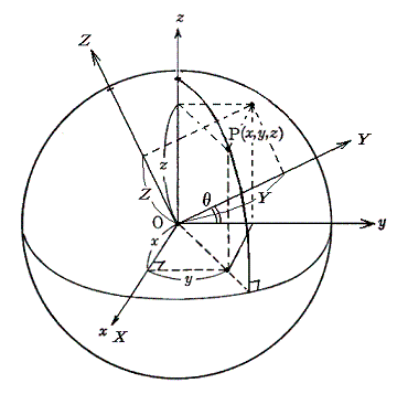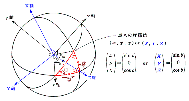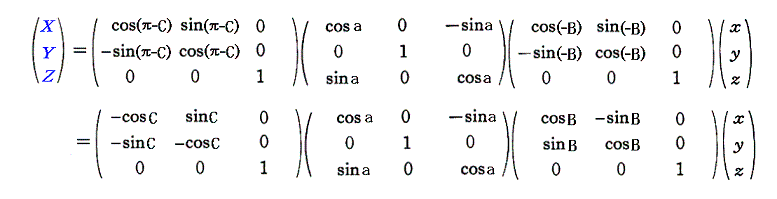 上図に於いて、座標系(x,y,z)を@z軸の周りに角度(−B)だけ回し、次にA新しいy軸の周りに角度aだけ回転する。そして最後にB新しいz軸の周りに角度(π−C)だけ回転すると座標系(X,Y,Z)が得られる。