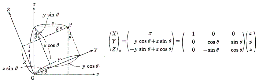 上図の(x,y,z)座標系をx軸の周りに角度θだけ回転させた座標系を(X,Y,Z)とする。その際、右手系の場合反時計周りに正とする。そうすると点Pの(X,Y,Z)の値は(x,y,z)とθを用いると以下のように表される。