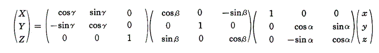 この3つの回転行列を用いれば任意の回転で得られる新座標系(X,Y,Z)の座標値を旧座標系(x,y,z)の座標値で表すことが出来る。今新しい座標系(X,Y,Z)が旧座標系(x,y,z)をx軸の周りに角度αだけ回転させて(x,Y’,Z’)とし、それをさらにY’軸の周りに角度βだけ回転させて(X’,Y’,Z)とする。そしてさらにZ軸の周りに角度γだけ回転させることによって(X,Y,Z)に一致させることが出来るとすると新旧の座標は次式で関係づけられる。