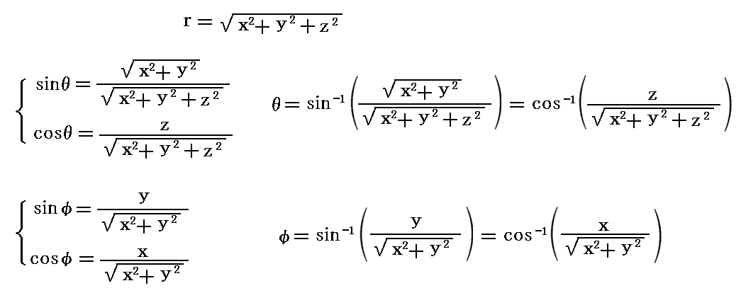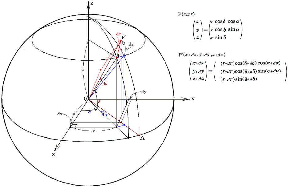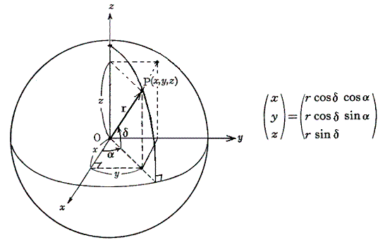 天球上の天体Pの位置は下図の様に右手系3次元直交座標系や、極座標系で表すことができる。それぞれの成分表示を(x,y,z)と(r,α,δ)すると、図から明らかなように両者は下記の関係式で結びつけられる。