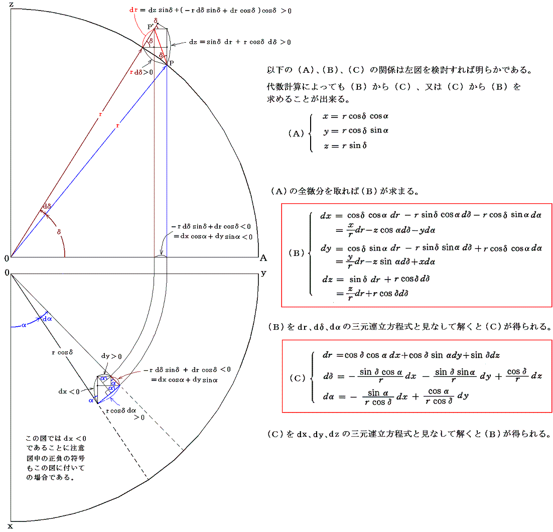 ここで、P(x,y,z)をP’(x+dx,y+dy,z+dz)に変化させたときの微少変位dx,dy,dzとdr,dα,dδの間の関係を求める。