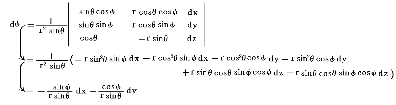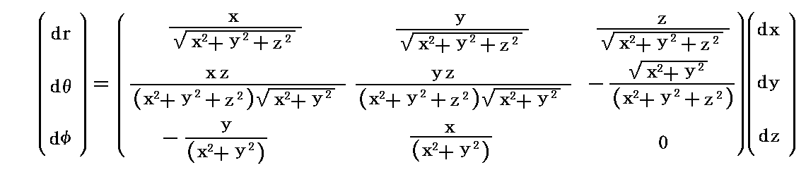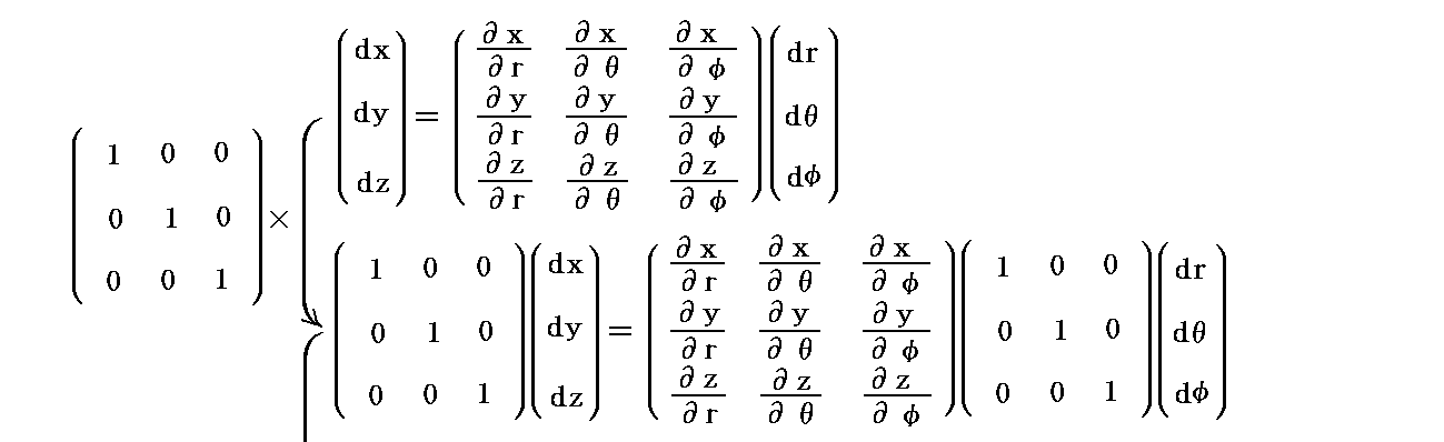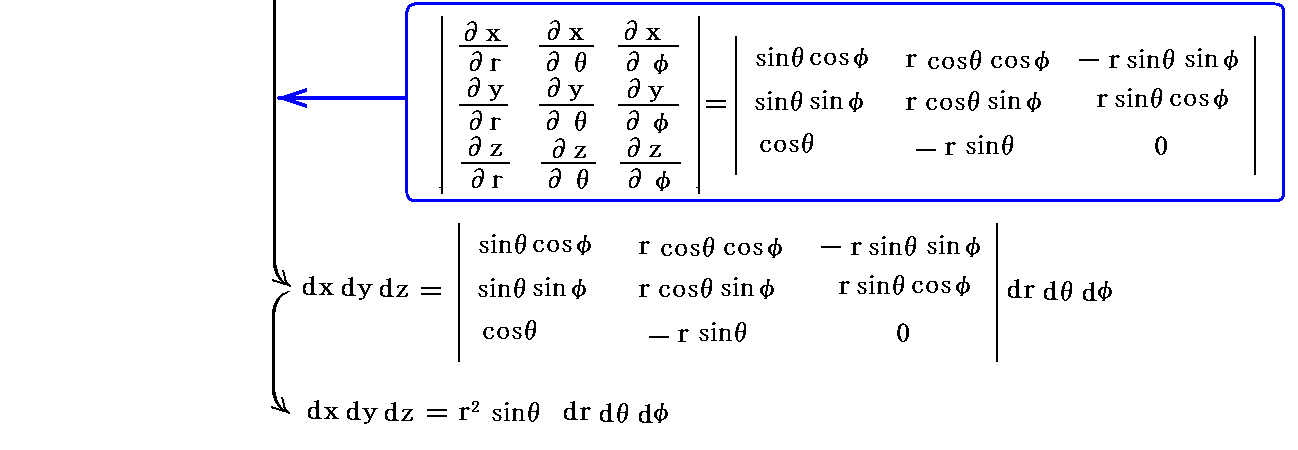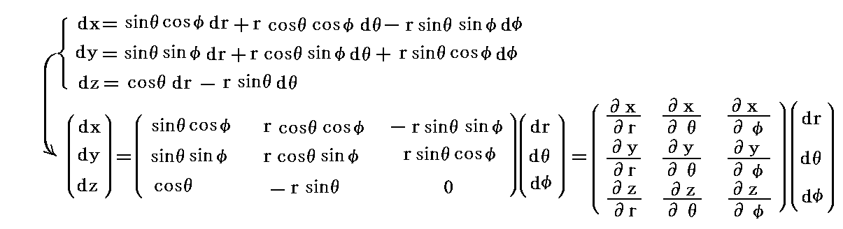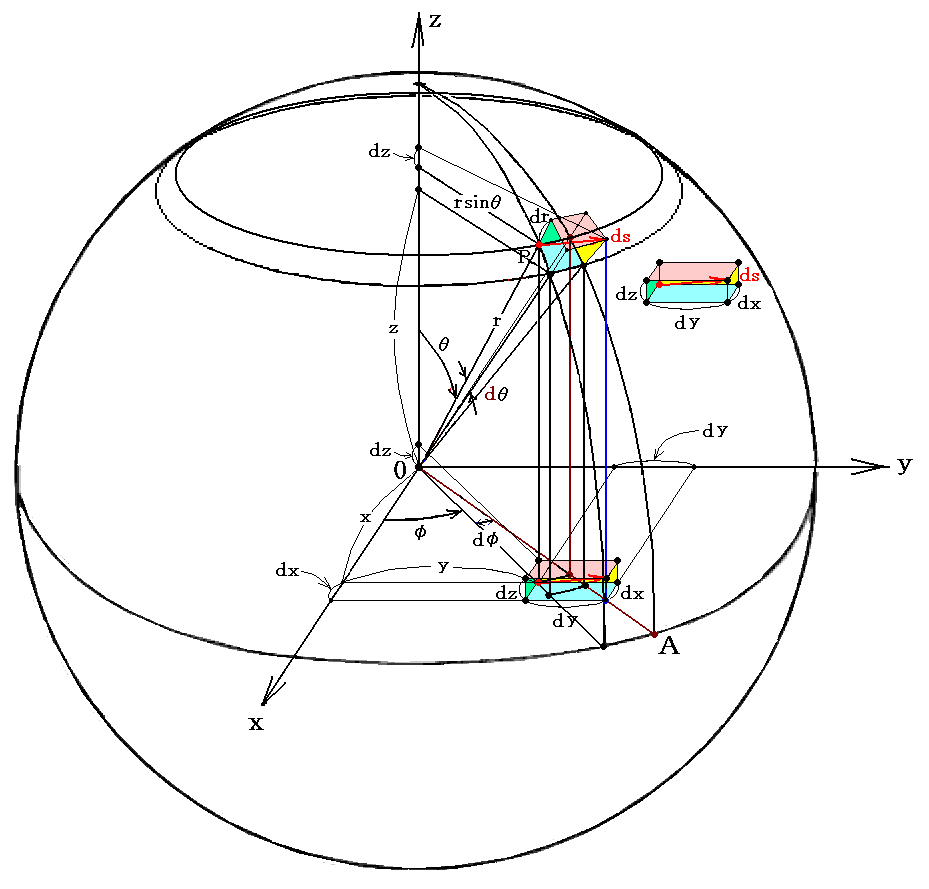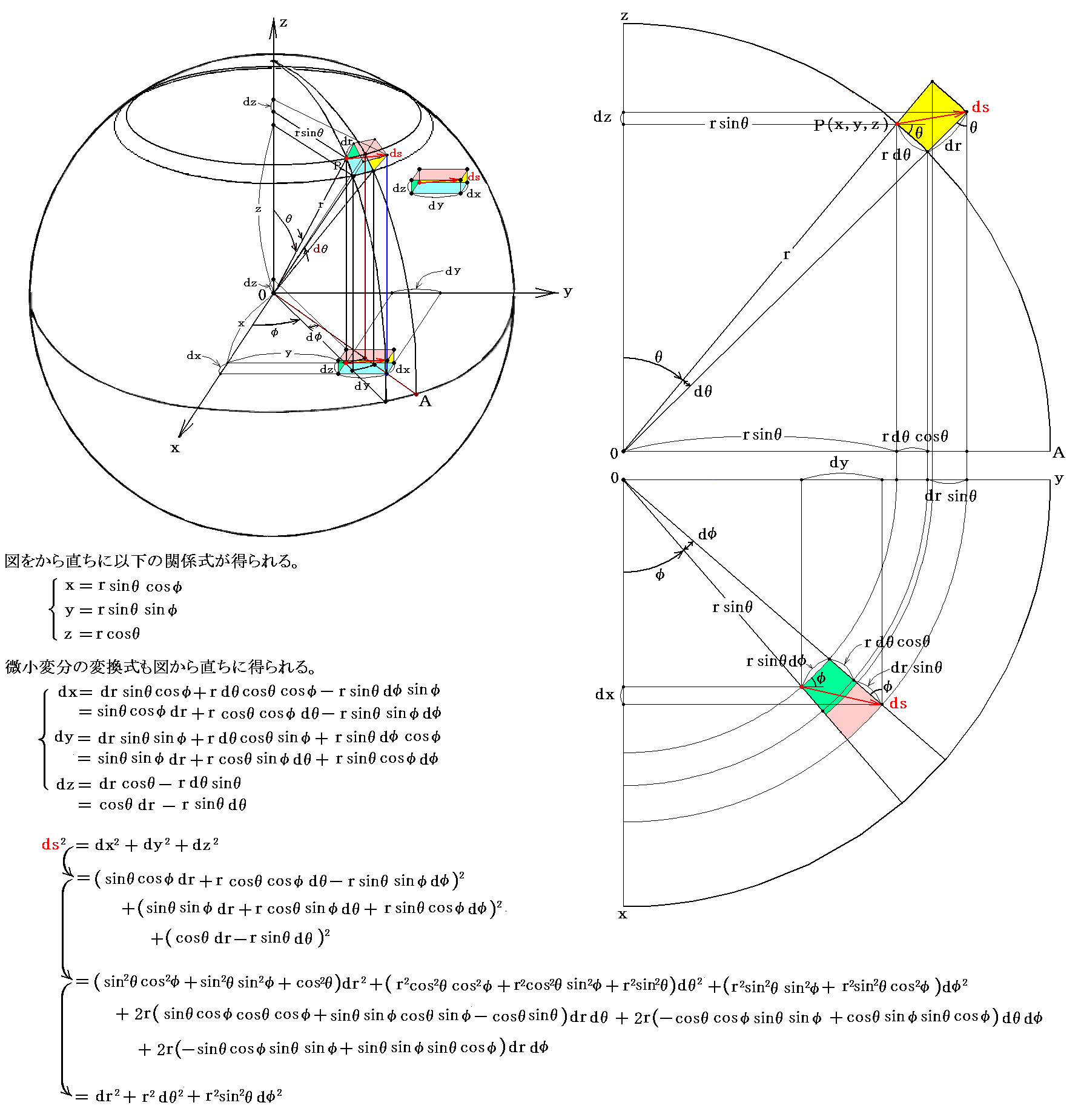 このとき上式は、下図で示されている同じdsを形成するdxdydzの微小体積素片の実際の体積値とdrddθdφで構成される微小体積素片の実際の体積値との関係を示しているのではありません。