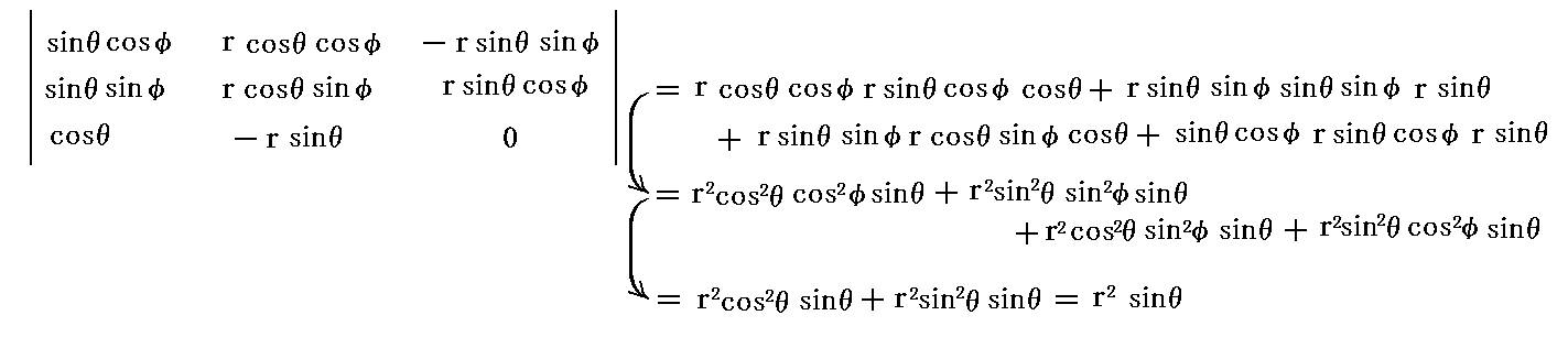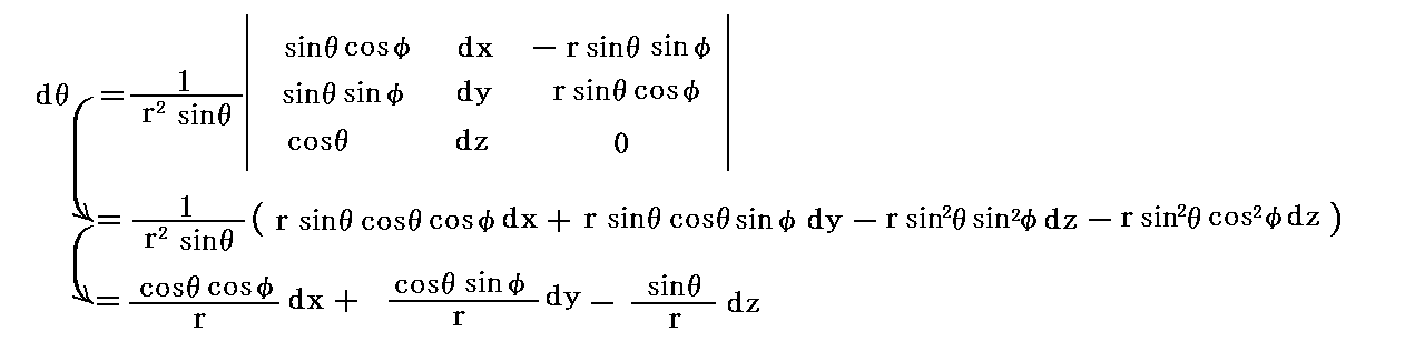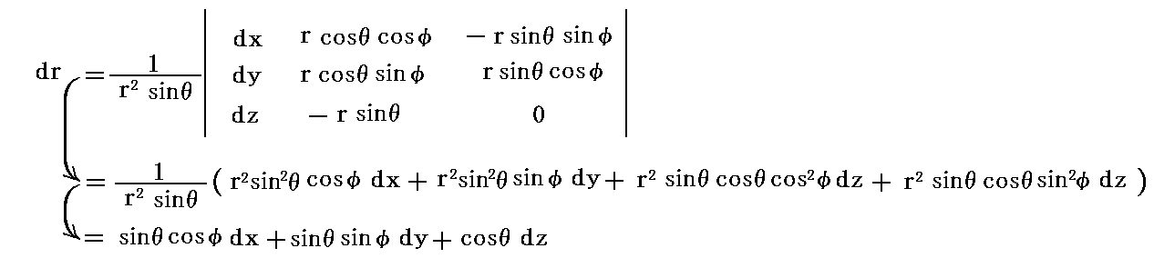それでは、“Jacobiqn”=|∂(x,y,z)/∂(r,θ,φ)|=r2sinθは何を表しているのかといいますと、 dx=1,dy=1,dz=1 で構成される体積素片の実際の体積値と、 dr=1,dθ=1radian,dφ=1radian で構成される体積素片の実際の体積値との比を表しています。この場合、“Jacobian”はrとθの関数ですから、この比は場所と共に変化します。