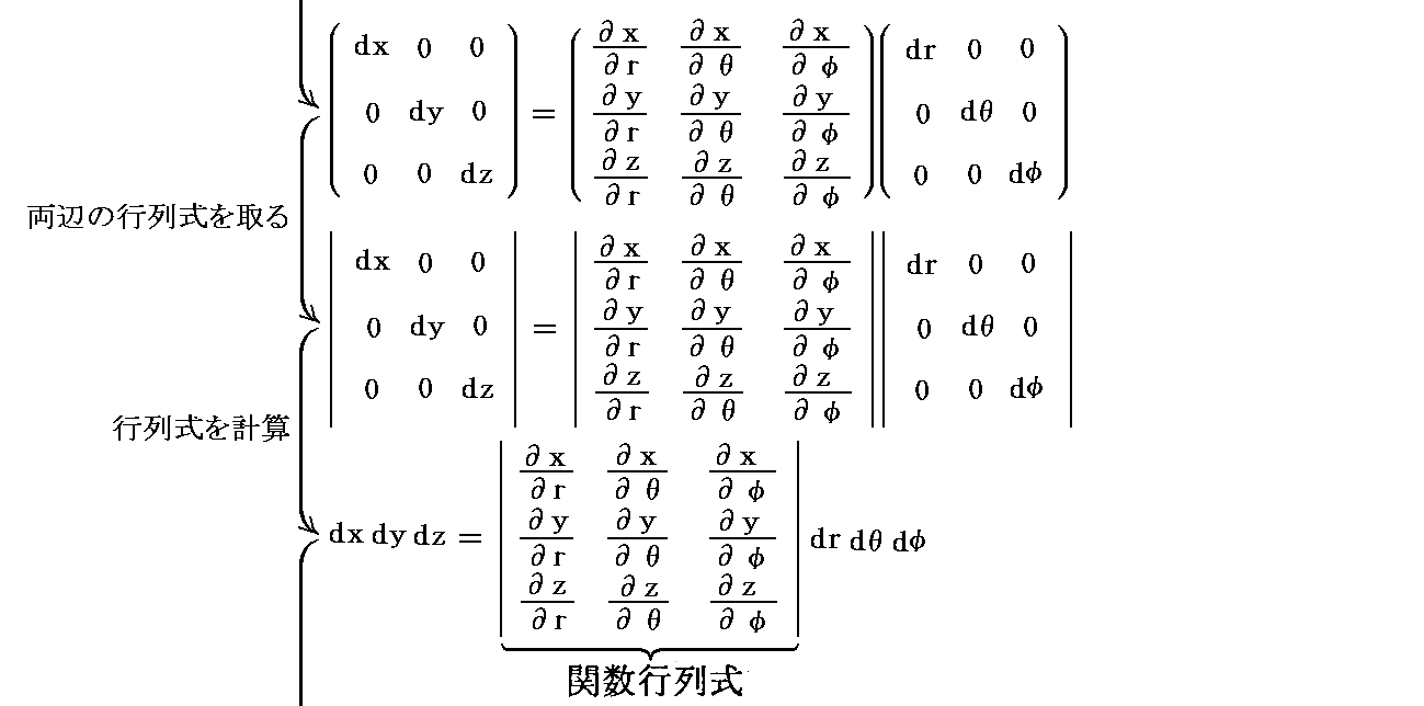 多重積分の座標変換で必要になる体積素の変換式(ヤコビの定理)を導くと以下の様になる。