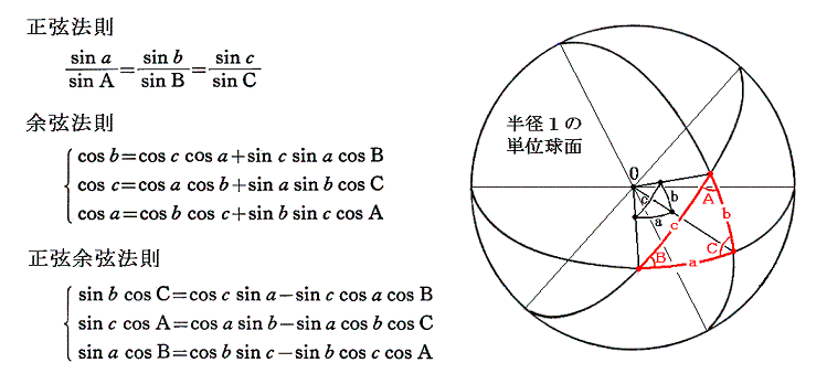球面三角形とは3つの異なる大円で作られる三角形のことである。大円とは、球を球の中心を通る平面で切ったときの切り口の円のことである。次図の様な単位球面上の球面三角形ABCで、3つの角A、B、Cと3つの辺a、b、cが定まる。これらの間に下記の関係が成り立つ。