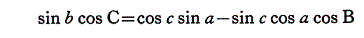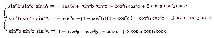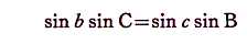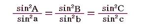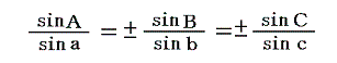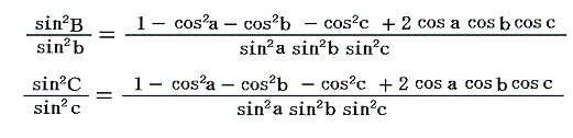 となる。ここでA、B、C、a、b、cはすべてπより小であるから+の符号のみを選択すればよい。そうすると正弦法則が得られる。