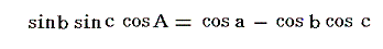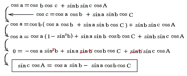となり球面三角形の余弦法則が得られる。角Aに関して得られた(3)式は、角度について(A→B→C→A)、辺について(a→b→c→a)の置き換えを順番にすることによって角B、角Cについての式となる。