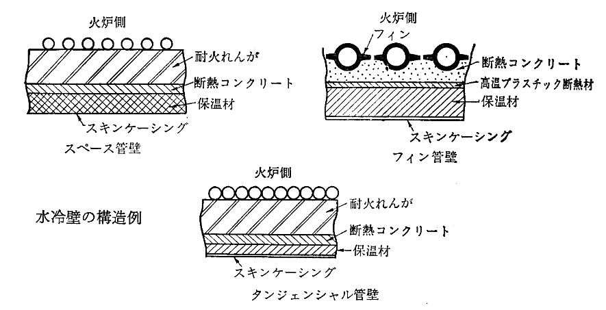 最近の火力発電所のボイラーには高温・高圧・大容量のものが要求される。そのとき燃焼室温度が高温化すると、伝熱量が温度の4乗に比例して増大する放射熱が、接触熱伝達に勝ってくる。このため炉壁が高熱となり焼損し易くなる。これを防止すると同時に水の蒸発・過熱を円滑に行うために、燃焼室の周囲の壁のすべてに直径20〜100mmの水管を縦に並べて水管による炉壁をつくる形のボイラーが主流となった。この炉壁を水冷壁(water