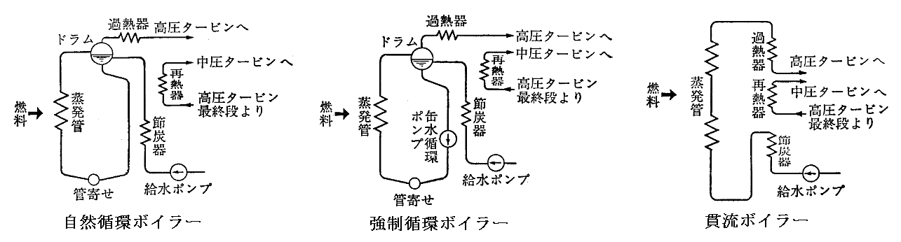 そのため蒸気圧力が増加すると密度差による自然循環型ボイラー(下左図)では缶水の循環が円滑に行かなくなる。蒸気圧力の増大とともに、ボイラー水の循環経路に循環ポンプを設置して強制的に水を循環される強制循環型ボイラー(下中図)が発達してきた。
