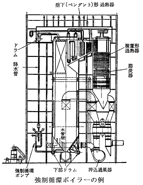 このような自然循環ボイラーでは水の循環が円滑に行くように水頭を高く(40〜50m)し、ドラムからの降水母管を太くして、これが加熱されないように炉外に設置する形になっている。