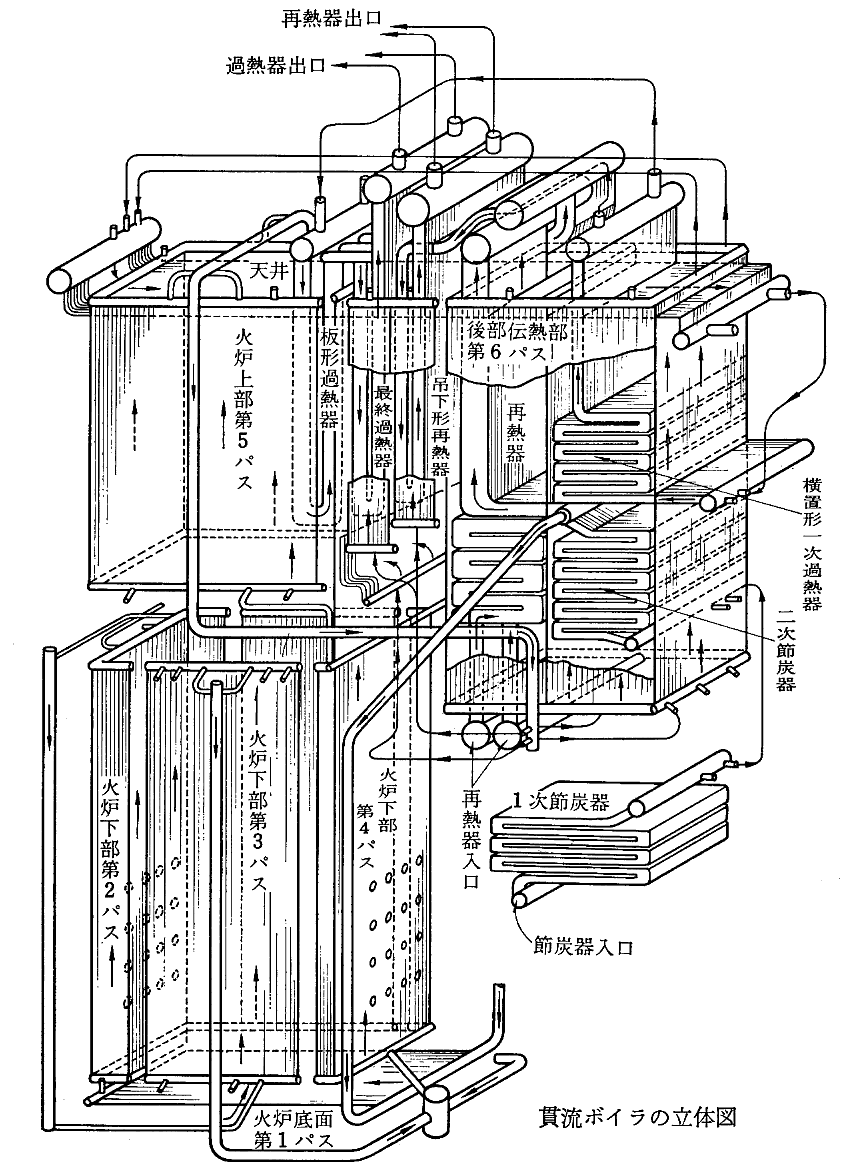 さらに、蒸気圧力が臨界圧力を超えると液体と気体の区別が無くなる。そうなると途中の気水分離ドラムの意味はなくなる。そのため給水をボイラーにポンプで圧入した後は節炭器→蒸発管→過熱管を貫流する間に熱吸収を行って他端から順次過熱蒸気としてタービンに送る形式の貫流型ボイラー(下右図)となる。