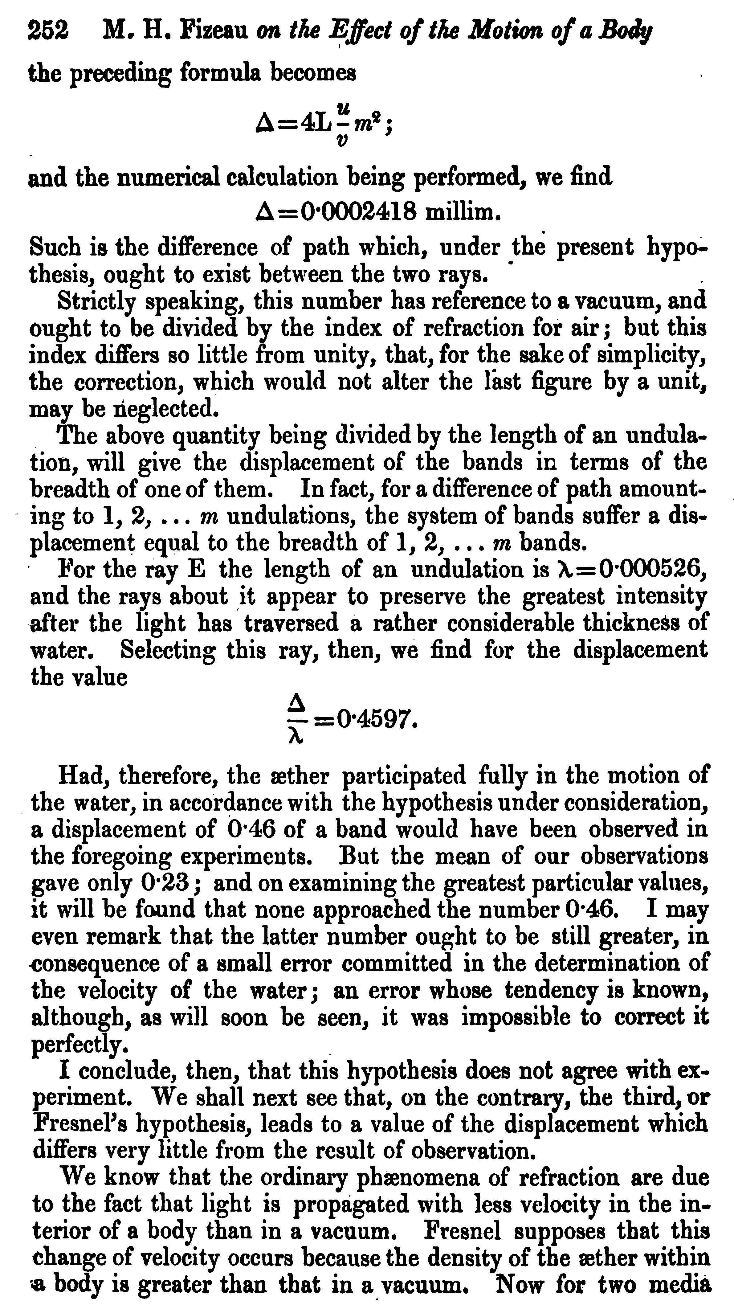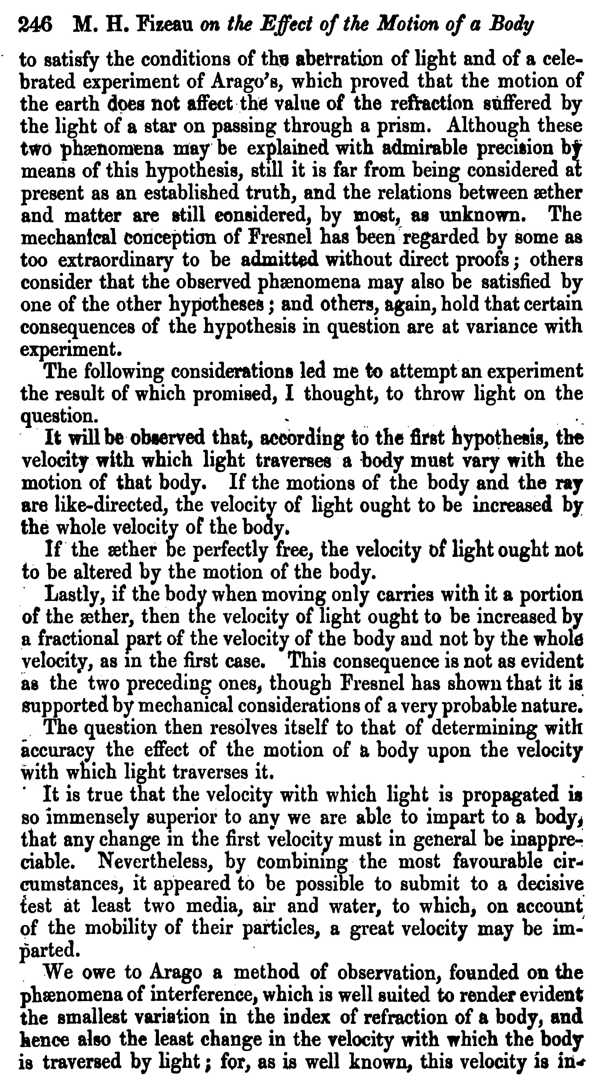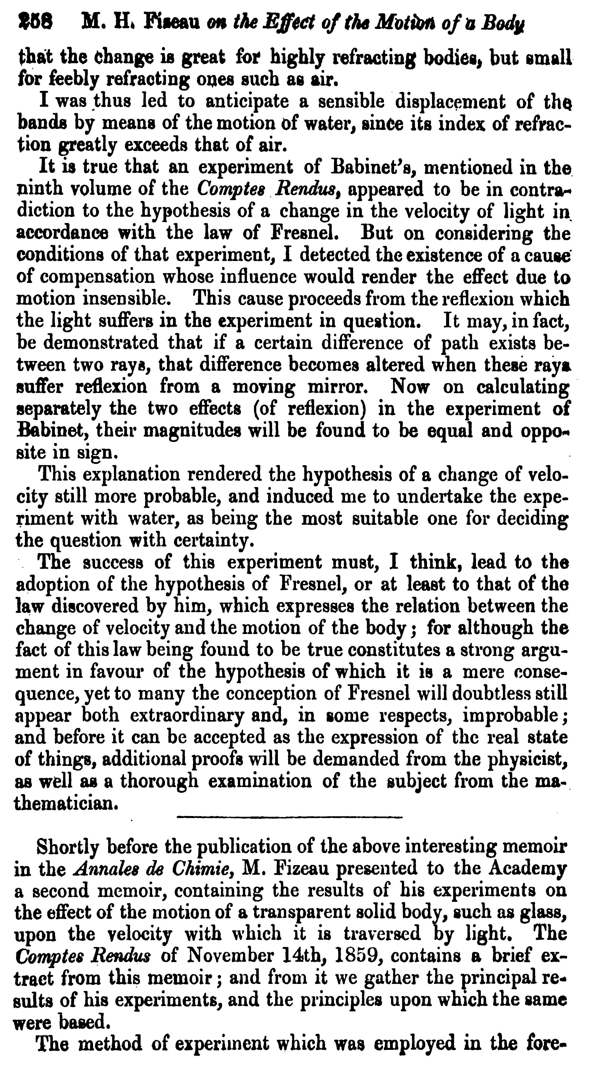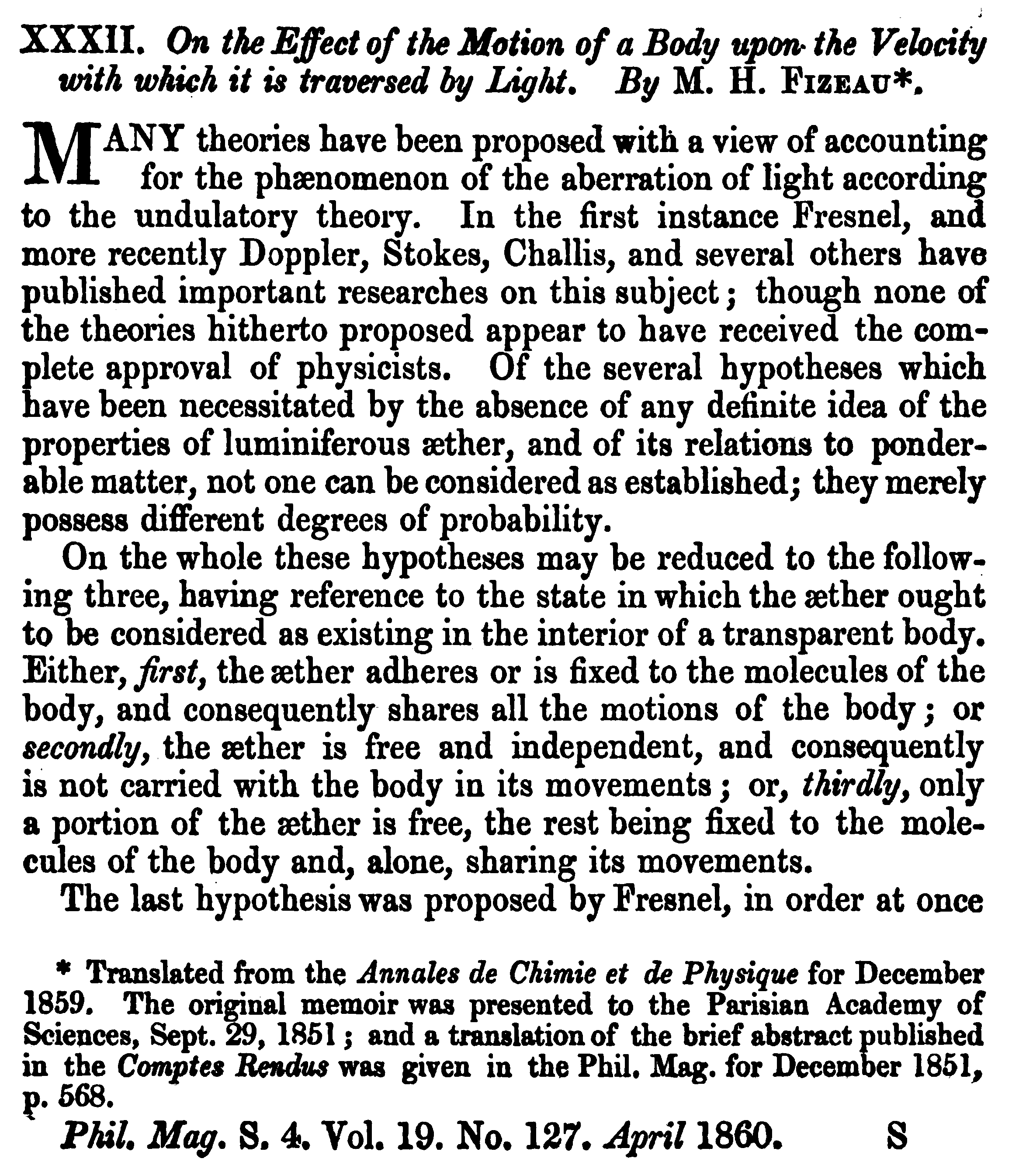 Hippolyte Fizeau, “光が伝播している物体の運動の光の速度への影響について”