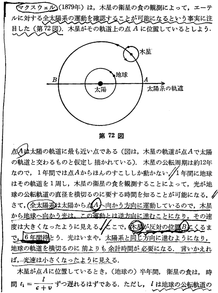 実際、マックスウェルは、航海年鑑局のディヴィッド・ペック・トッド(アルバート・マイケルソンの同僚)に、既存の木星衛星の食観測データの中にこの事を確かめるに足る精度のものが有るかどうかを手紙で問いあわせています。しかし残念ながらマックスウェルの時代の観測にはその精度はありませんでした。[ここは別稿も参照]