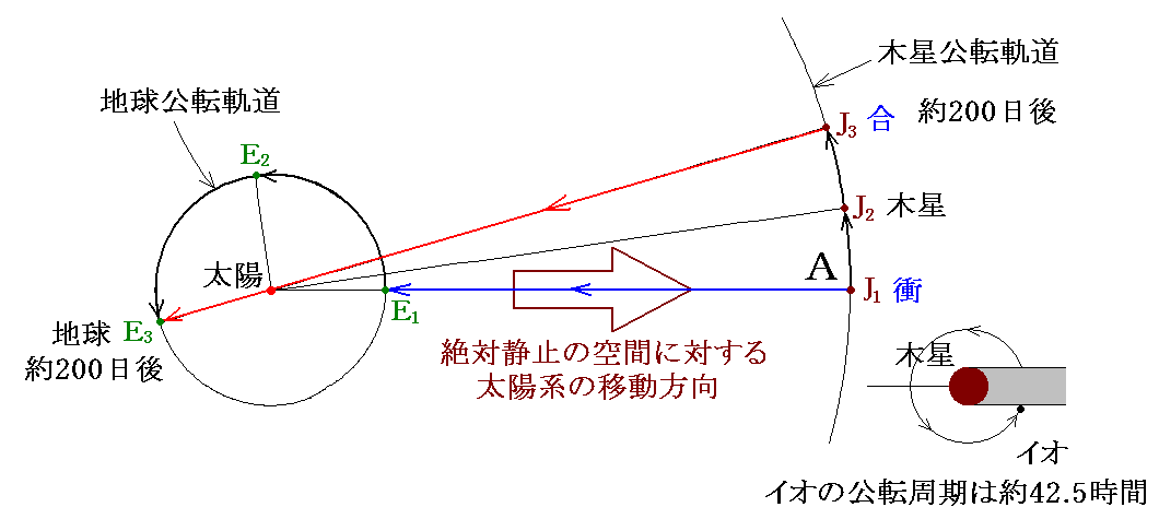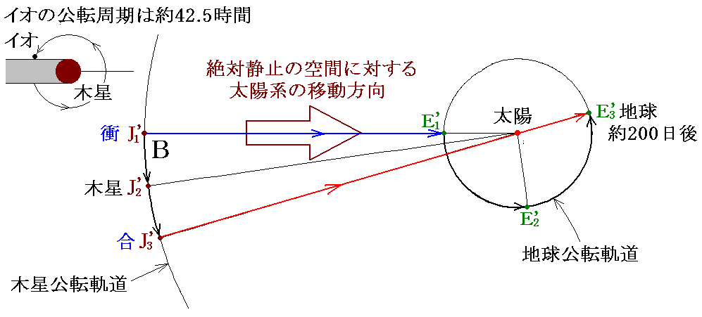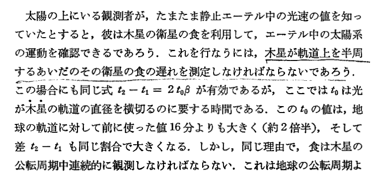 これは有る意味1887年に、エーテルの風を検出することを目的に行われたマイケルソン・モーリーの実験の天文版です。しかも、これはv/cの一次の効果で現れるものです。すなわち、絶対静止のエーテルの理論が正しいのなら、木星がAの位置に居るときとBの位置に居るときでは、木星の衛星の食現象が起こる時刻の遅れの200日間にわたる積算値が異なるはずです。それは約4秒程度となる。