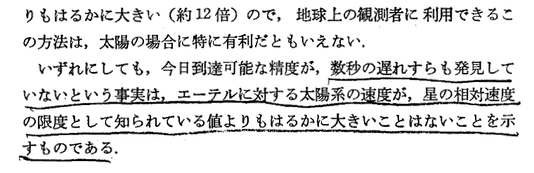 今日の観測技術を用いれば、上記の時間差は充分に計測可能だと思われますから、実際に観測してみればエーテルの風を検出できるかも知れない。しかし、アインシュタインの特殊相対性理論が正しい限りその様な時間差は観測できないのです。実際、あらゆる類似の実験・観測の結果がその様になることを示しています。