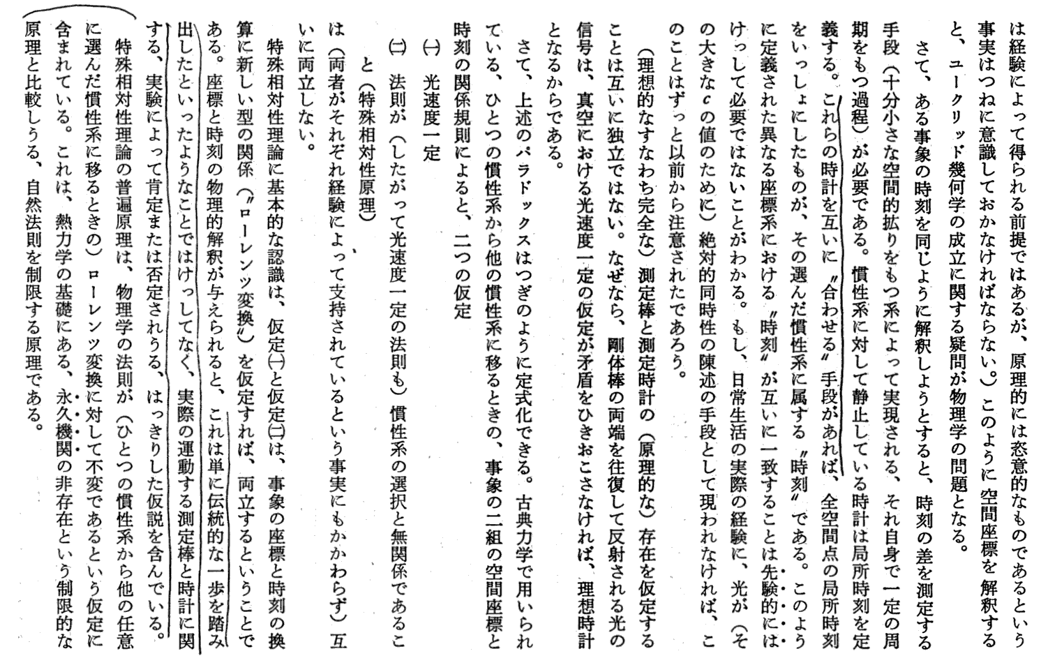 また、“ローレンツ変換が四次元空間における回転にほかならないことをもしめした。”ですが、自然法則が共変でなければならない座標変換とは、その原点を空間的にずらす事も含めた座標変換では無いと言うことです。座標の原点を固定して、時間座標軸と空間座標軸の関係(つまり互いの座標軸の交叉の仕方、斜交座標の斜交の仕方を変えると言うことです。この座標変換に対して共変でなければならないと言うことです。もちろん、その様な座標変換に限っても、その中には異なった速度(加速度)で動いている座標系への座標変換を含んでいます。また、空間座標についてもその斜交角が時間的に任意の変化をする斜交座標系への座標変換を含んでいます。