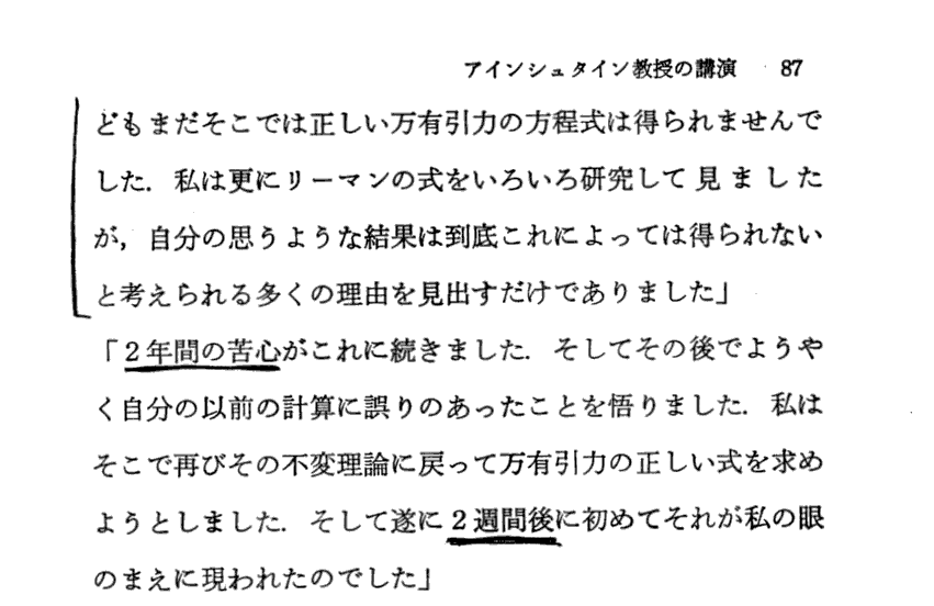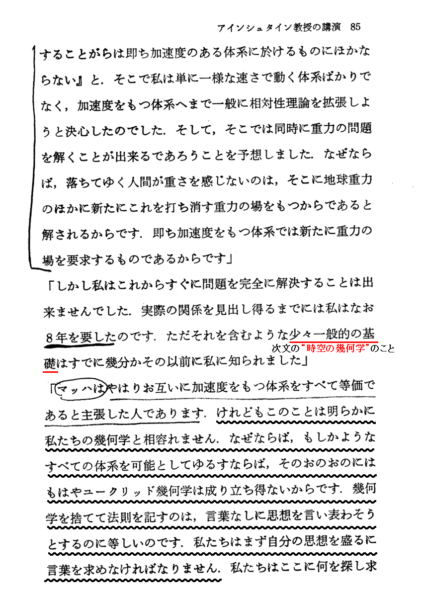86 この述懐から推察できるのですが、Einsteinは重力の問題は時空の歪みと深く関係することを早くから認識していたようですね。