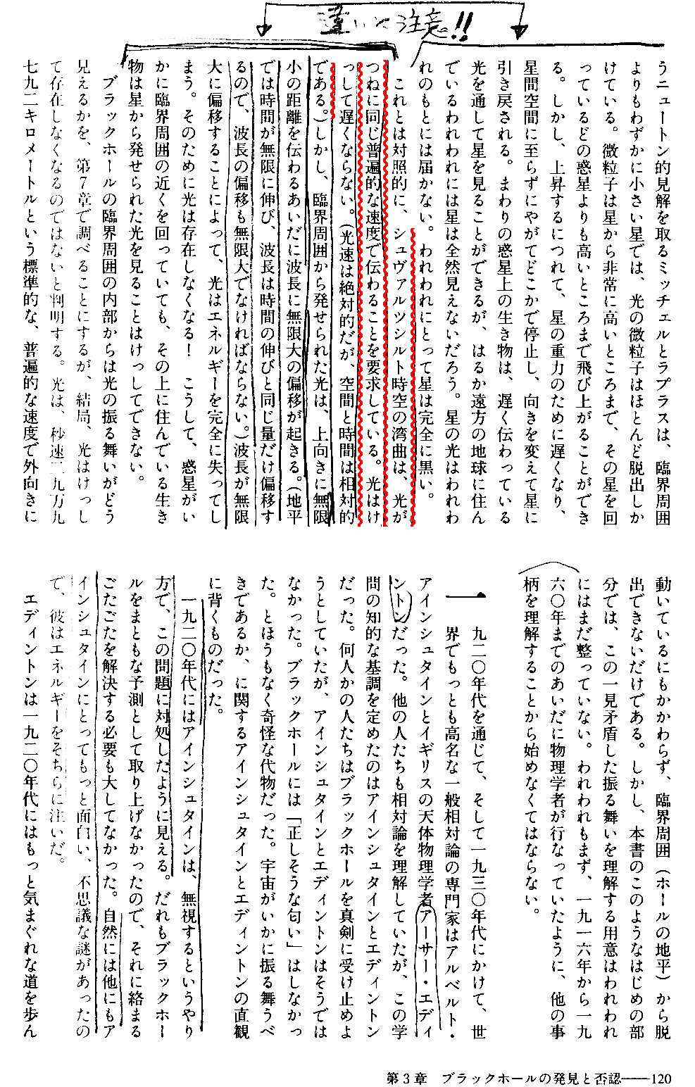しかし、彼らの考えた光りがブラックホールから抜け出せないメカニズムと、今日考えられている光りがブラックホールの地平から抜け出ることはできないという時のメカニズムは全く異なります。このことについてはKip S. Thorne著「ブラックホールと時空の歪み」(白揚社1997年刊)の第3章をご覧下さい。特にp120の説明をご覧下さい。ちなみにジョン・ミッチェルはキャベンディシュの実験の捩り秤の発明者です。