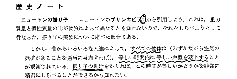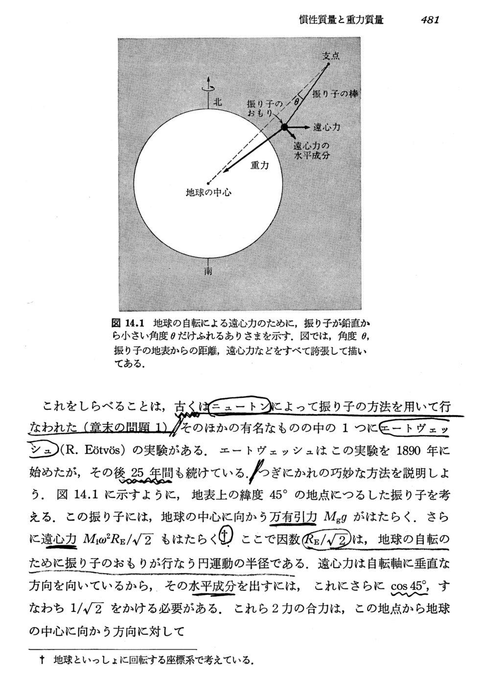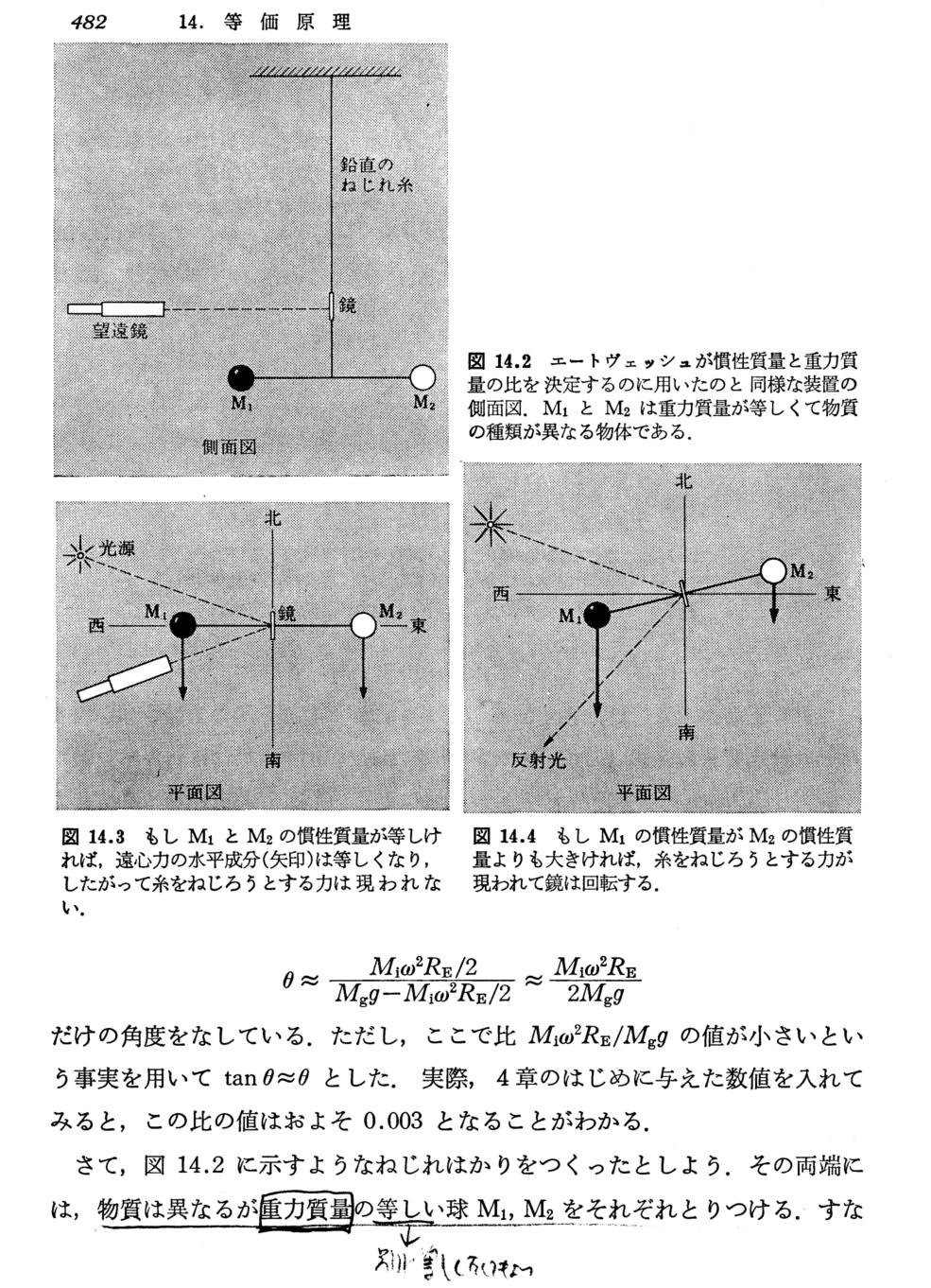 エートヴェッシュの実験の本質は上記赤波線部分にあることに注意されたし。つまり装置全体を静かにゆっくり180度回転させても、捩り秤のワイヤーの取り付け部に対して、ワイヤーにぶら下がっている竿の捩りの様子が全く変化しなかったというところにある。