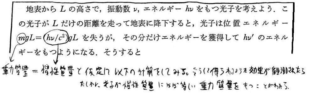 つまり、光子を放出した原子の軌道電子は、恒星表面から飛び出てきた光子の無限遠における振動数ν’と同じ振動数で振動していたのです。それは重力場の無いところでの振動数νよりも少ない振動数ν’=ν−Δν で振動していたことを示している。