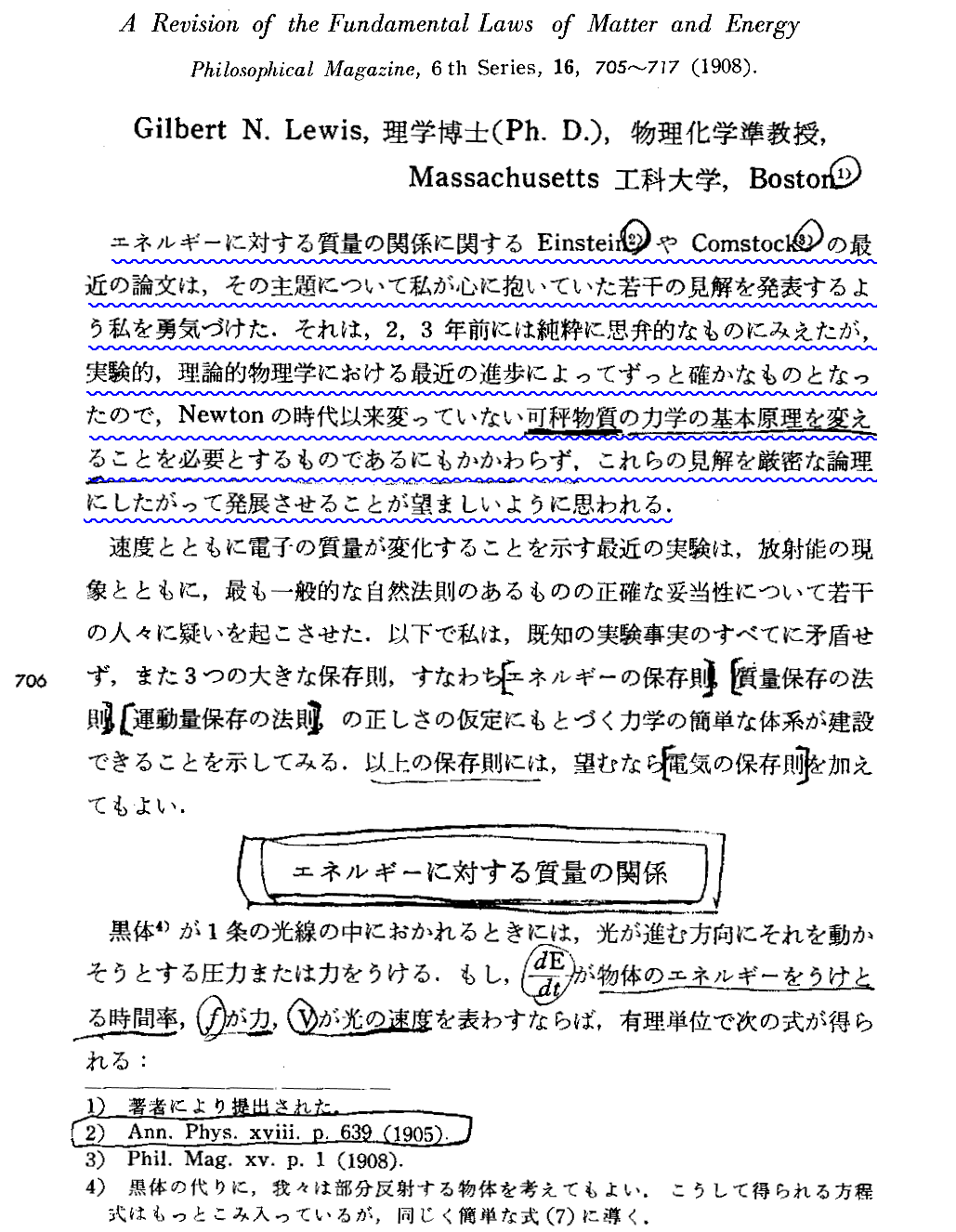 Lewisは、化学反応のさいに質量保存の原理が成立するかどうかを実験的に検証しようとしたH.H.Landoltの研究に刺激されてエネルギーと質量との関係に関心をいだき、輻射圧の考察から相対論とはまったく独立に、物体のエネルギー変化は質量変化を伴う事を結論し、質量は物体に固有であるという考えを訂正していわゆる相対論的質量の表現形を導いた。