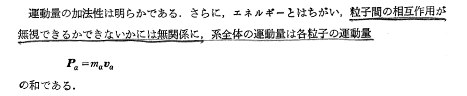 上記の“粒子間の相互作用が無視できるかできないかには無関係に運動量保存則は成り立つ”については、別稿「力積と運動量」2を参照されたし。そこで説明したように、“運動量保存則”はもともと[運動の第二法則]と[運動の第三法則(作用反作用の法則)]から導かれるものだったからです。