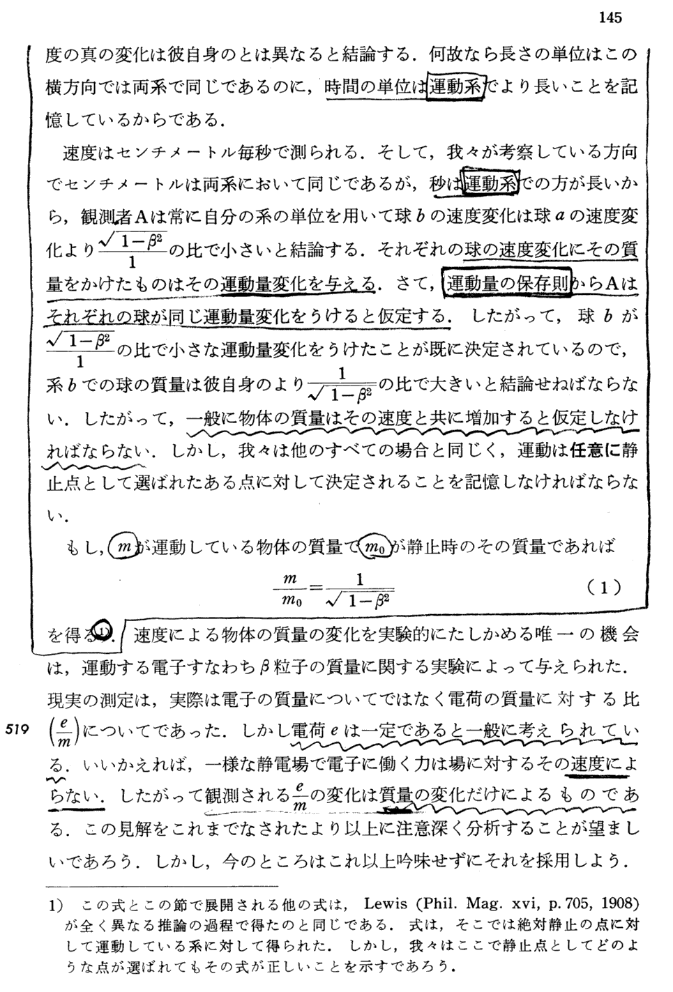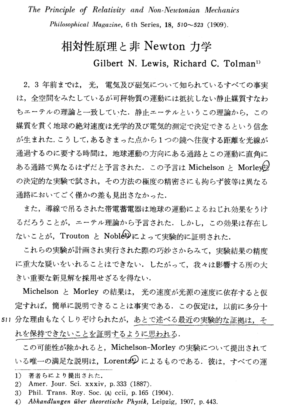 相対論的な質量(運動量)を運動量保存則から導くLewisとTolmanの有名な証明は、原論文のp517〜518に書かれているが、非常に難解です。別稿のBornの解説をあらかじめ読んでおかないと理解するのは難しいです。
