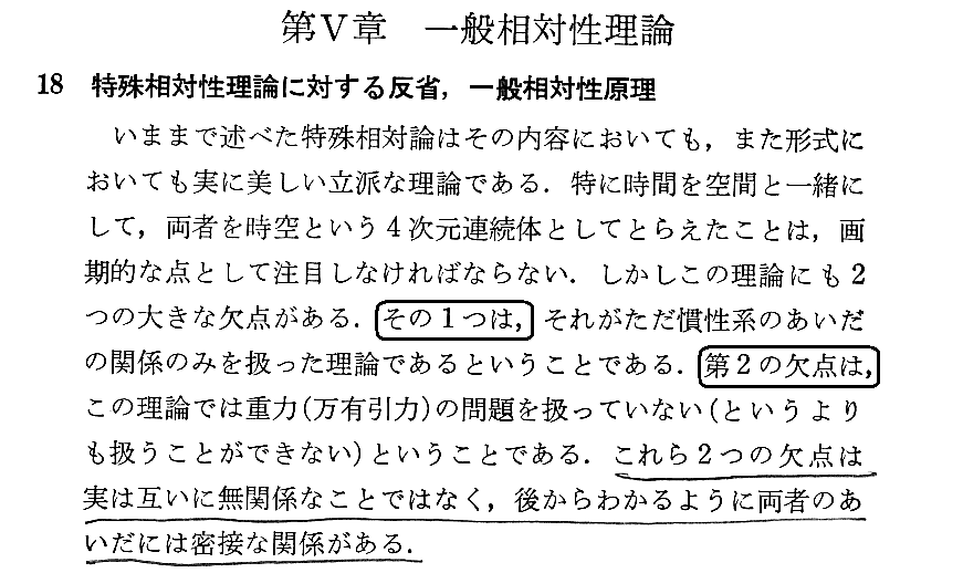Einsteinが偉大なのは、特殊相対性理論の発見により、その事の可能性に気付いたことです。彼は1905年に特殊相対性理論を作り上げてからすぐに(1907年頃)特殊相対性理論が完全ではなく内部矛盾を抱えていることに気付きます。そのことは、1916年著書「わが相対性理論」§21〜23、1921年ブリンストン大学講演第3回講義、1922年講演、1933年講演などで繰り返し語っています(このことは別稿3.で説明した)。