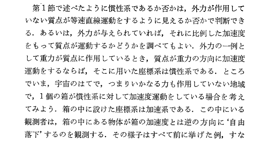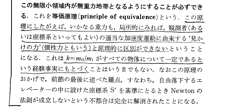 我々の住んでいるリーマン時空は重力場の存在と表裏一体の歪んだ時空です。そのとき、我々がその重力場の中で自由落下する状況になれば、我々の周囲は歪んでいないミンコフスキー時空となり、そのなかの時計の進みは本来のものとなり、物指し棒の長さも本来の長さになります。