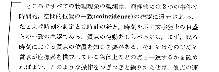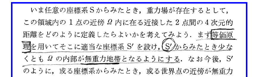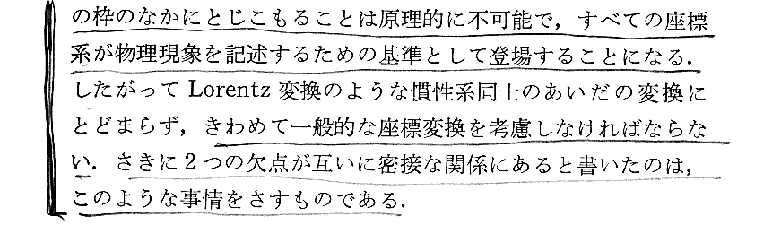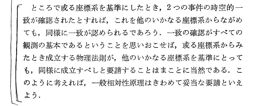 何が難しいかというと、Einsteint自身が「自伝ノート」第5段落で述懐しているように、“時空(座標と言っても良い)が様々な物理現象を直接に測り定める絶対的な計量的意味を持っているという思い込みから自らを解き放つこと”です。