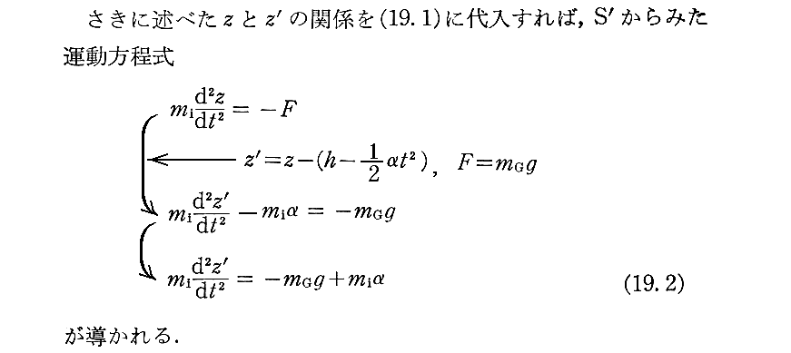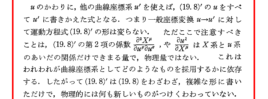 (19.8)"式は別稿「微分幾何学」3.(6)2.や「等価原理」5.(4)で説明している“測地線方程式”そのものです。そこの導き方と比較されると解るのですが、ここで説明されている内山先生の“測地線方程式”の導き方はとても教育的で秀逸です。