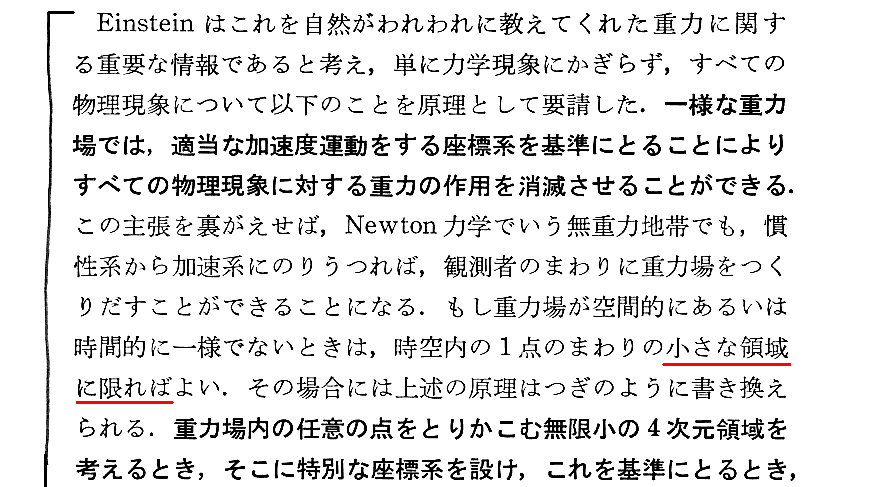 ただし、ミンコフスキー時空として認識できるのは極狭い領域のみです。たとえ自由落下している時空であっても周囲の広い範囲を見れば重力場を消すことはできず時空の歪みを消しさることはできません。周囲は必然的に歪んだ時空になっています。