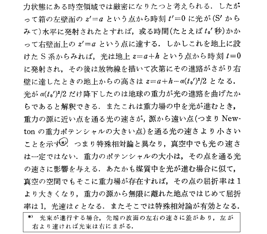 上記の重力場中の光速は遅くなるという言い方は誤解を招きやすい。重力場中では物指し棒が縮み時計はゆっくり進みますから、その重力場中の物指し棒と時計で測定した光速度は慣性系中を進む光の光速度と同じです。重力場から無限に離れた地点からみて光りはゆっくり進む様に見えると言うことです。それは別稿のシャピロの実験などで実際に確かめる事ができます。