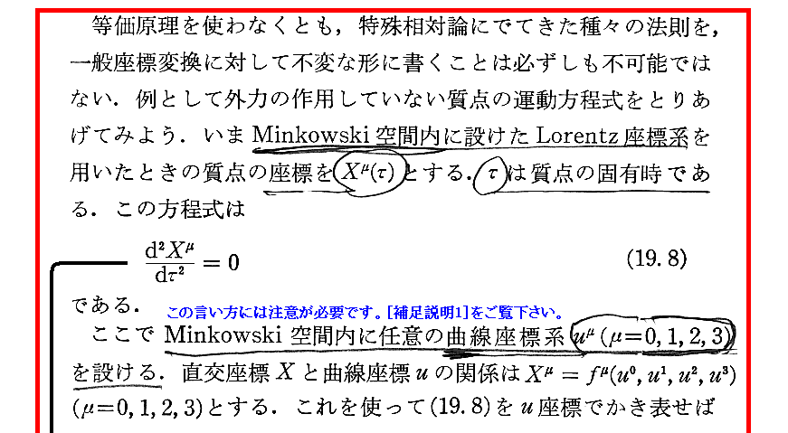 ただし、文中の“Minkowski空間内に任意の曲線座標系uμを設ける。”は正しい言い方では在りません。“リーマン空間の中に設ける。”が正しい。Minkowski空間に設けた曲線座標系のクリストッフェル記号からは、どのように曲線座標が引かれていようとも空間の歪みを表すゼロでない曲率テンソル成分は出てきません(別稿4.(3)[例8]および4.(5)2.[補足説明2]参照)。クリストッフェル記号がゼロでないことが直接空間の曲がり(重力場の存在)を表すわけではありません。重力場が存在したら曲率成分がゼロでないものが導かれるクリストッフェル記号を生じるような座標への座標変換(19.5)式になると言うことです。そうして座標変換された曲線座標は必然的にリーマン空間に引かれた斜交曲線座標となります。