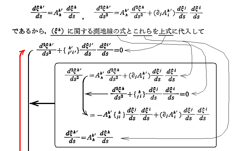 の逆を行っているのです。二つの説明を比較するとクリストッフェル記号の座標変換の意味が良く解ります。さらに、 [ここの測地線方程式に付いての解説] と [別稿藤井文献§19“測地運動方程式”の解説] を比較してみられたし。
