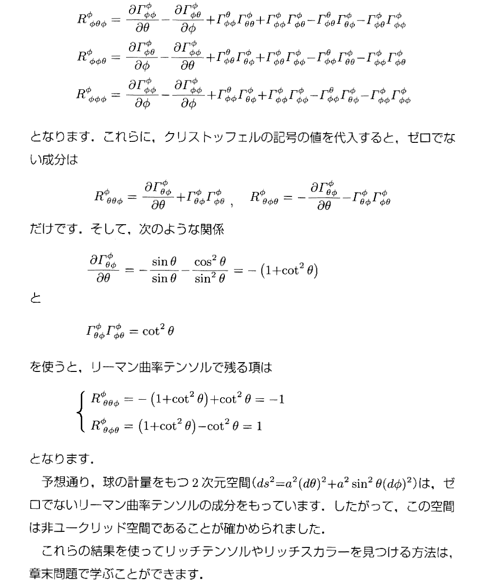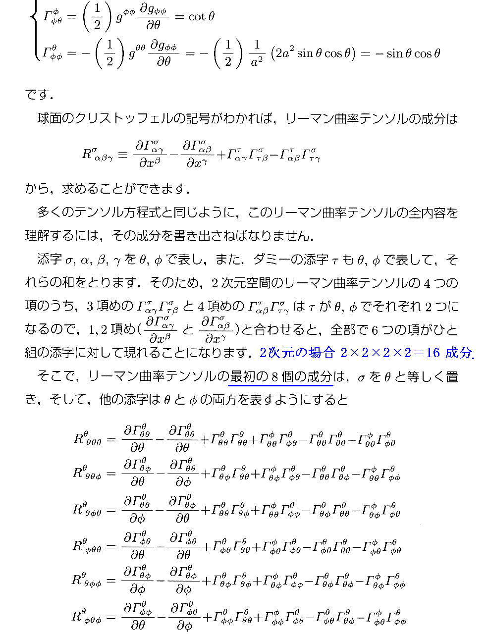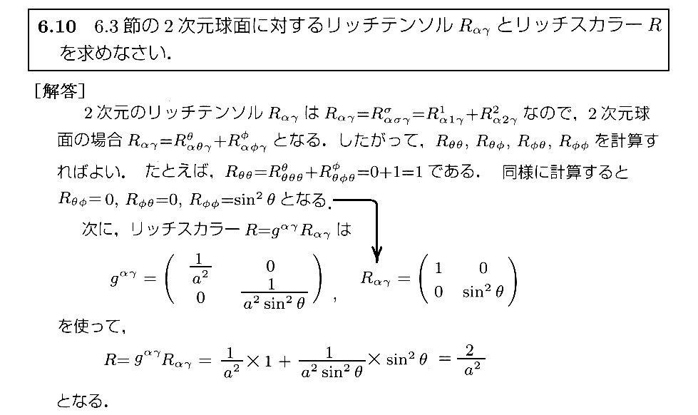 リッチテンソルとリッチスカラーはEinsteinの“重力場方程式”(6.33)式の左辺を構成する要素(6.32)式です。その二次元の場合の計算をここで練習している。