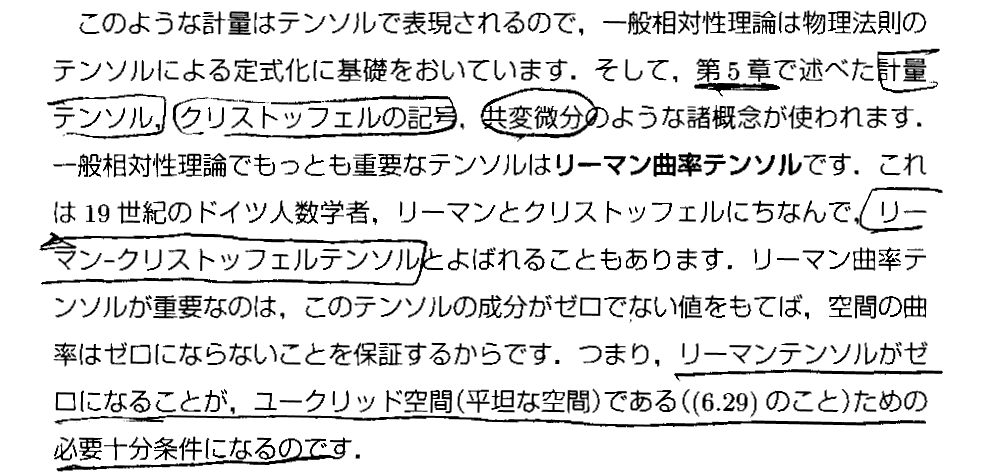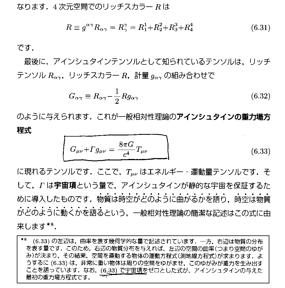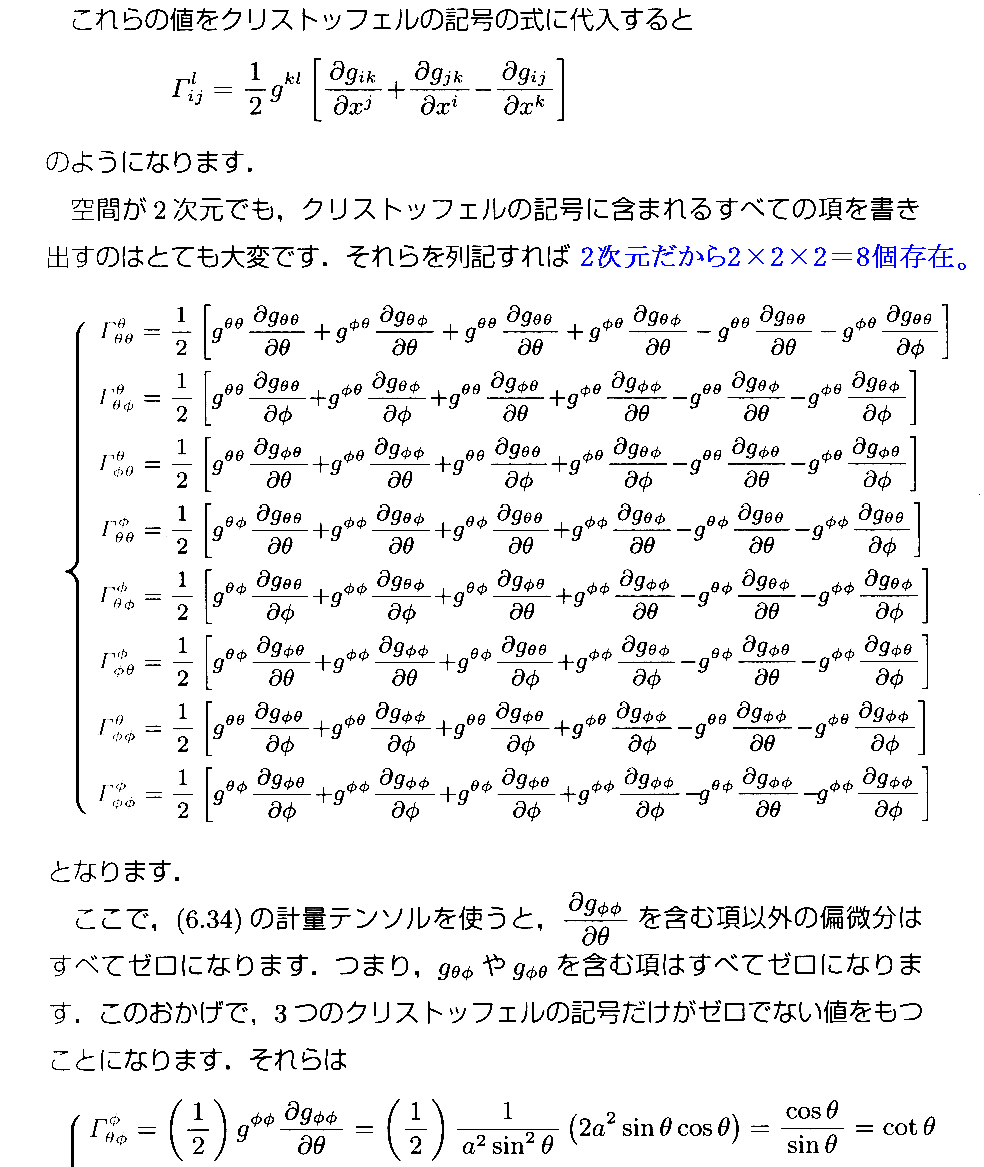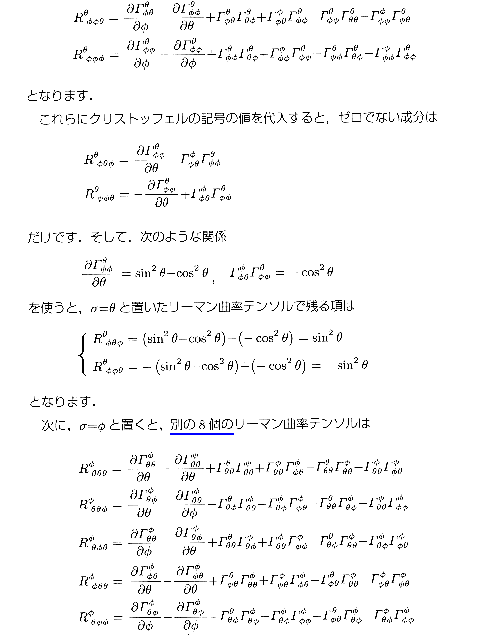 リッチテンソルとリッチスカラーはEinsteinの“重力場方程式”(6.33)式の左辺を構成する要素(6.32)式です。その二次元の場合の計算をここで練習している。