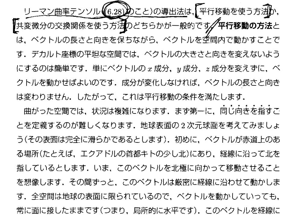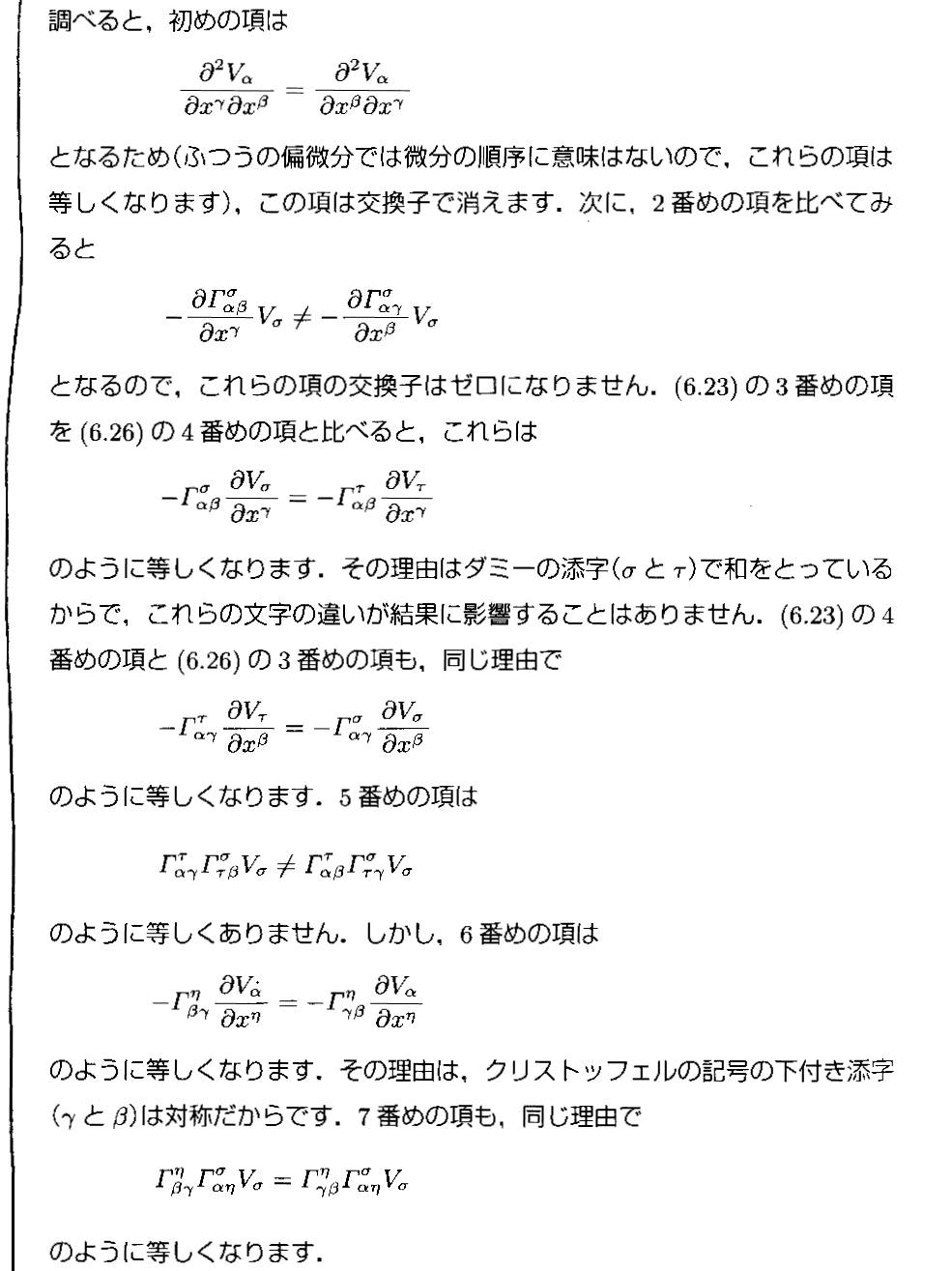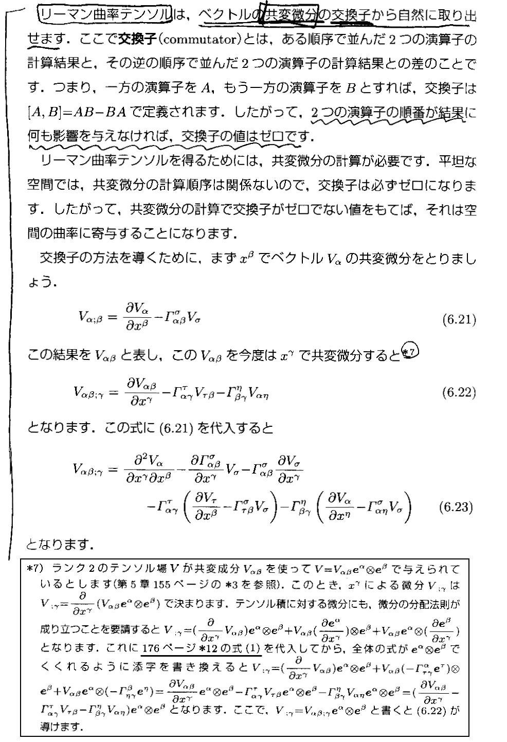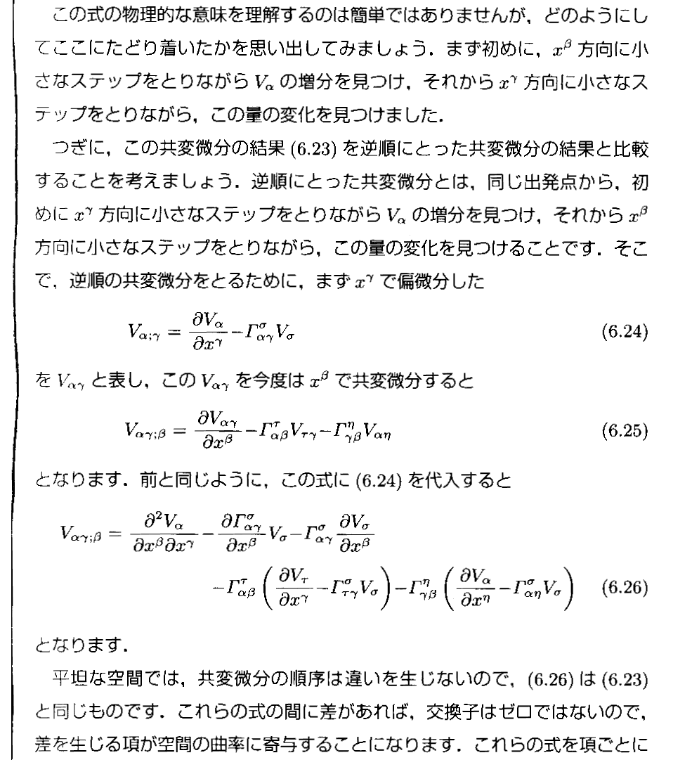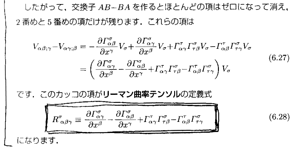 リーマン曲率テンソルを導くここのやり方は、別稿「微分幾何学3.(曲面の幾何学)」3.(5)、あるいは「テンソル解析学(絶対微分学)」6.(5)1.などをご覧下さい。