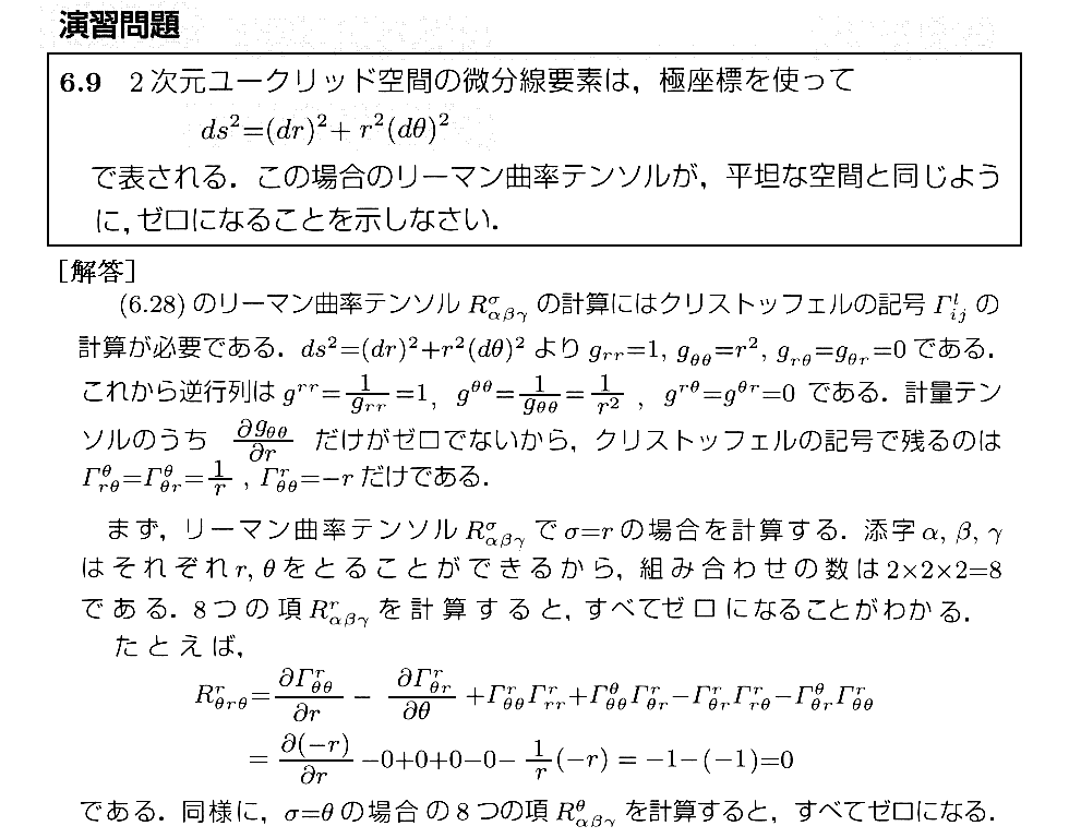 ここで示した2次元リーマン空間についての計算を別稿「基底ベクトル・双対基底ベクトルと反変成分・共変成分(計量テンソル・クリストッフェル記号・共変微分とは何か)」4.(3)[例8]の2次元ユークリッド空間についての計算(下記の問6.9)と比較してみられたし。