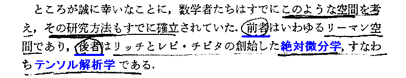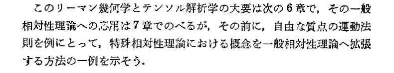 テンソル解析学が説明されている6章は別稿「テンソル解析学(絶対微分学)」で、また7章は別稿「テンソル解析学の一般相対性理論への応用」で引用しています。