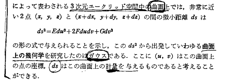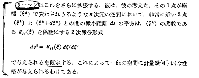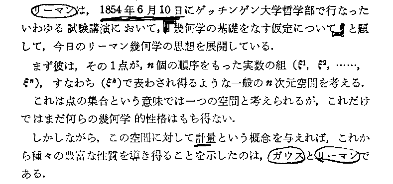 前記G.F.B.Riemannによるゲッチンゲン大学の私講師就任演説『幾何学の基礎をなす仮定について』(1854年6月10日)の日本語訳は矢野健太郎 訳・解説「現代数学の系譜10 リーマン幾何学とその応用」共立出版(1971年刊)にありますが、その内容は極めて難解です。この講演については別稿[補足説明1]の佐藤文隆先生の解説をご覧下さい。